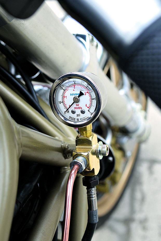 Motocykl, choć nie stroni od nowoczesności, został stworzony tak, aby jak najbardziej odpowiadał nurtowi, jaki reprezentuje. Dlatego na próżno szukać tu plastiku, włókien węglowych czy laminatów. Nawet zgrabny zadupek zwieńczony gustowną lampką wykonany został całkowicie z metalu. Choć waży niemal tonę, daje satysfakcję, że jest kawałem „prawdziwego”, solidnego tworzywa. Kierunkowskazy wykonano z anodyzowanego aluminium z efektem szczotkowanego metalu. Podnóżki także poddano modyfikacji i anodyzowano, a basowo grzmiące tłumiki wraz z kolektorami to już własnoręczna robota.