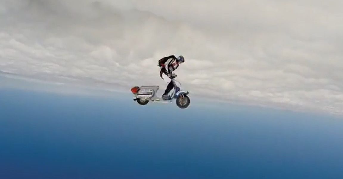 Tak, tak nasi drodzy, nie przesłyszeliście się. Jeżeli wydaje się Wam, że skakanie z wysokości 4 tysięcy metrów to absurd, to dołóżcie do tego włoski skuter – to mieszanka wybuchowa!