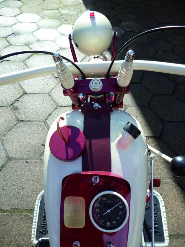 Zbiornik paliwa, pochodzący z IŻ-a 49, również został znaleziony na bazarze motocyklowym w Poznaniu. Był rozcięty wzdłuż, co niedwuznacznie zasugerowało mi zrobienie – wzorem HD WLA – jednej połówki na paliwo, a drugiej – na olej. Pomiędzy zbiornikami znalazły się akumulator i regulator napięcia, co pozwoliło zachować przestronność w części między siodłem a skrzynią biegów. Podobnie wyglądały motocykle przed blisko stu laty.