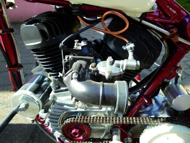 Kierownicę wykonałem w mojej firmie – J&J Motocykle – na wzór kierownic starych Indianów i Harleyów. 19-calowe koła motocykla pochodzą ze starej WFM-ki. Zastosowałem tylko wytrzymalsze łożyska i szprychy. Delikatne, pasujące do całości błotniki także zaadaptowałem z tego polskiego motocykla.