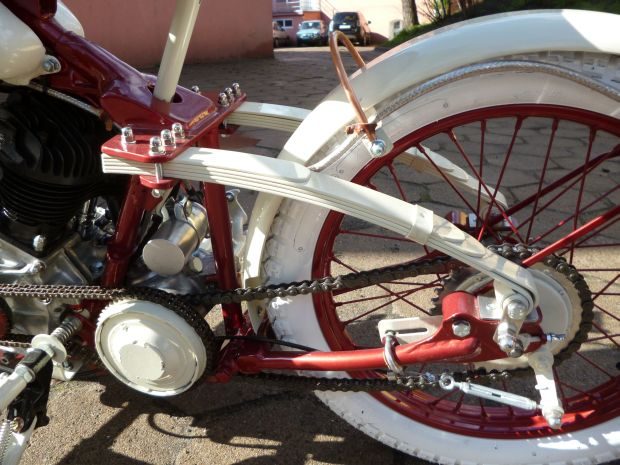 Motocykl jak sto lat temu W ruch poszły szlifierki kątowe i spawarka. Junakowy tył został oddzielony od harleyowego przodu. Jego miejsce zajął wyglądający na delikatny, ale solidny wahacz, wypatrzony kiedyś przeze mnie na bazarze motocyklowym. Elementami amortyzującymi są dwa półresory piórowe, umocowane w specjalnych uchwytach. Ponieważ niezbyt dobrze spisują się w tej roli, należało również […]