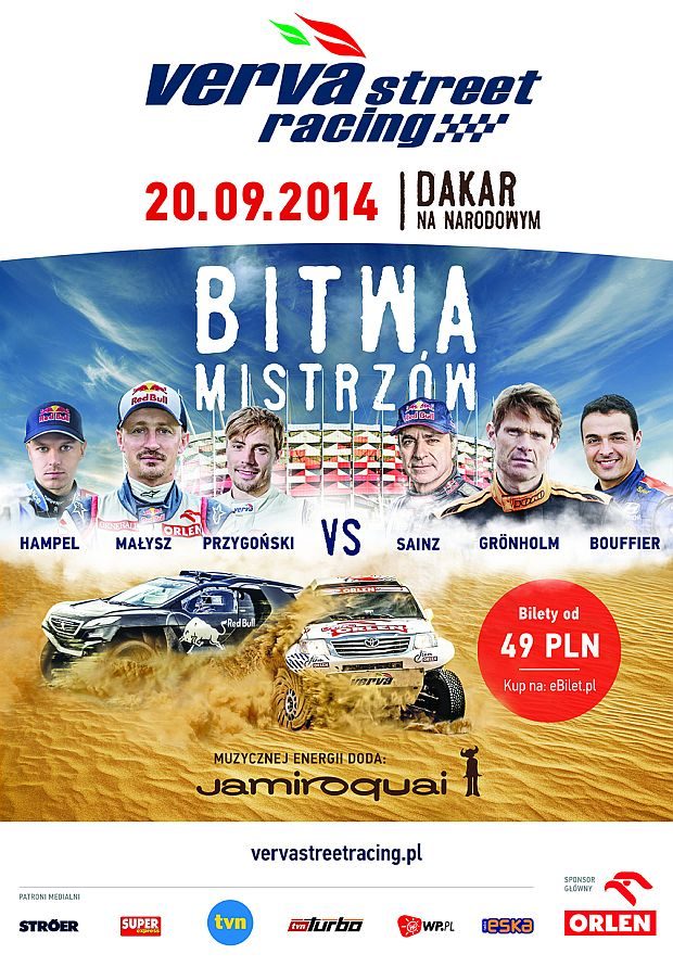 Główne show VERVA Street Racing – Dakar na Narodowym to przede wszystkim rajdowa Bitwa Mistrzów w sześciu kategoriach. Nowatorski format imprezy opierać się będzie na połączeniu motoryzacji z muzyką z najwyższej półki. Pomiędzy dakarowymi rundami, w trzech setach muzycznych wystąpi na żywo światowa gwiazda funku – zespół Jamiroquai, który wykona swoje największe hity.
