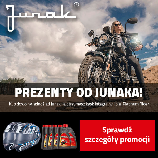 Teraz po zakupie jednośladu otrzymasz od marki Junak prezenty w postaci kasku motocyklowego oraz 5 L oleju! Bez względu na to czy będzie to skuter, motorower lub motocykl, każdy nowy nabywca otrzyma zestaw prezentów.