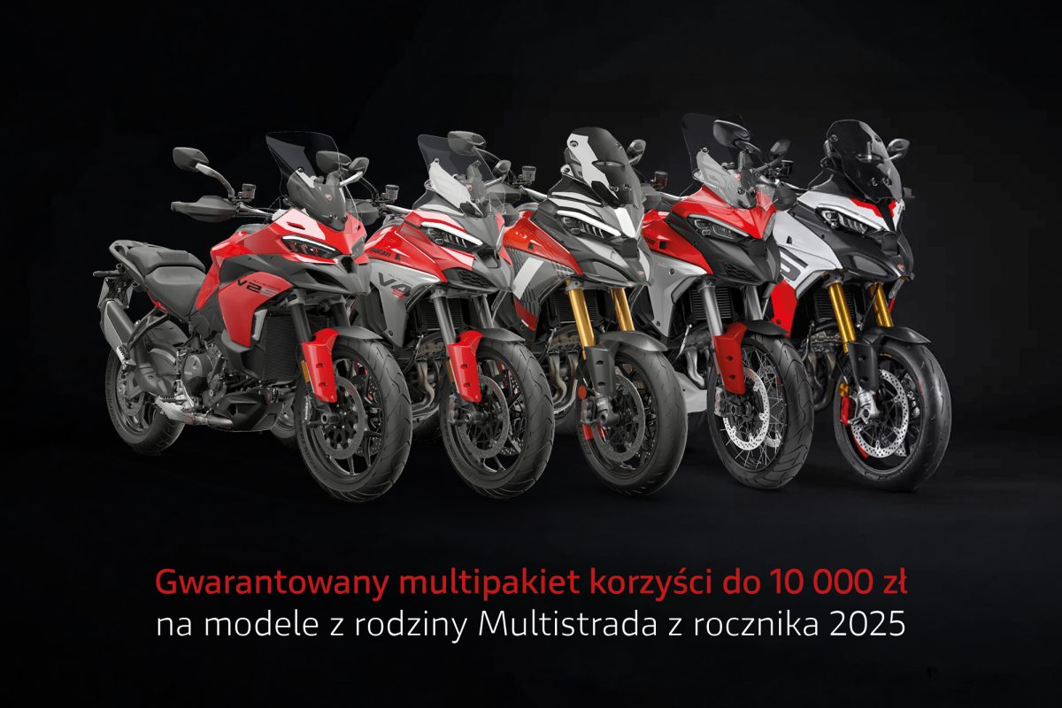 Tylko teraz przy zakupie fabrycznie nowej Multistrady z roku produkcji 2025 otrzymasz szeroki pakiet korzyści, w tym benefit cenowy sięgający nawet 8000 zł oraz rabat na zakup oryginalnej odzieży motocyklowej Ducati o wartości aż 2000 zł! Zależnie od wybranego modelu, łączna wartość tego pakietu może sięgać nawet 10 000 zł. Wszystkie modele Multistrada objęte promocją są fabrycznie nowe i objęte czteroletnią gwarancją 4Ever Ducati bez limitu kilometrów.