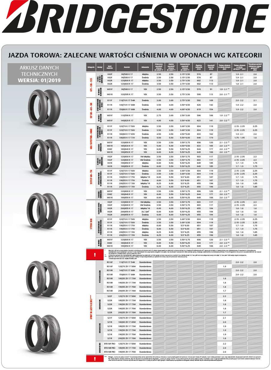 W przypadku drogowych gum, ciśnienie ustalane jest na podstawie m.in. orientacyjnej wagi motocykla i jej rozkładu wraz z kierowcą. W przeciwieństwie do opon wyścigowych, konstrukcja szosowych pozwala na zastosowanie jednego ciśnienia w wielu warunkach i pod szerokim zakresem obciążeń, dlatego na tym samym ciśnieniu może jeździć osoba o wadze 70 kg jak i 100 kg. Oczywiście jadąc z pasażerem i bagażem wypada zwiększyć ciśnienie w tylnej oponie. Na szczęście nie ma sensu wymyślać koła na nowo i samemu obliczać jakie ciśnienie musisz ustawić.