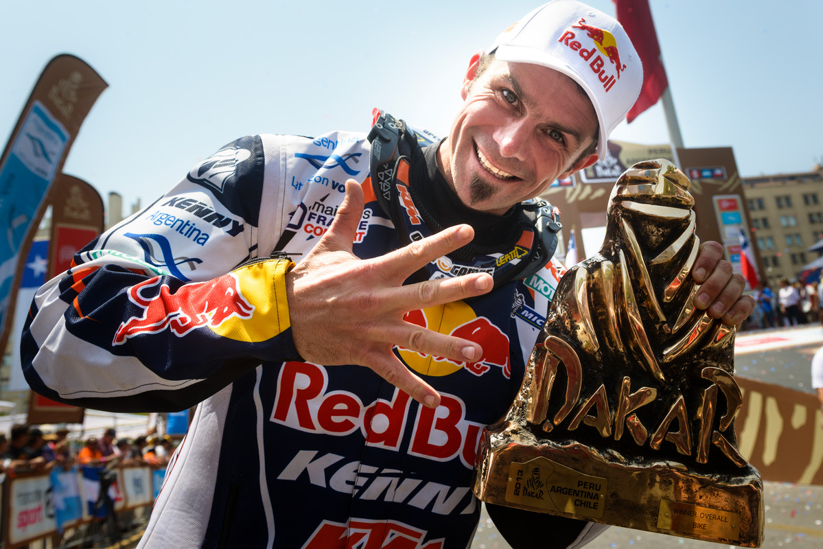 Cyril Despres celebrates at Dakar Rally podium in Santiago, Chile on January 20th, 2013 // Marcelo Maragni/Red Bull Content Pool // P-20130120-00049 // Usage for editorial use only // Please go to www.redbullcontentpool.com for further information. //