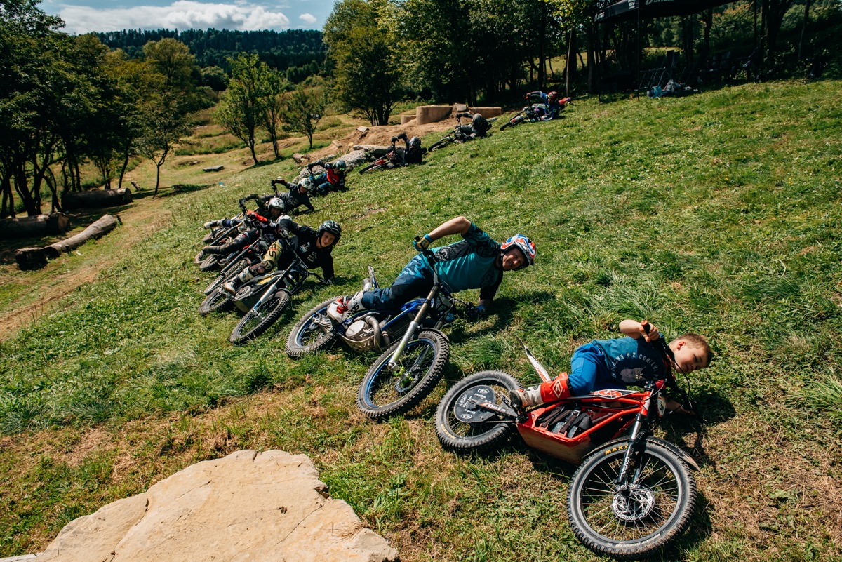 Tego lata wypoczynek mógł być nieco dłuższy, bowiem pod koniec lipca w Gęsim odbył się pierwszy w Bieszczadach tygodniowy obóz trialowy. W Pozostałych regionach Polski też jest to zresztą dosyć rzadka impreza. Dotychczas tylko Gabryś zorganizował jedną edycję w rodzinnym Nowym Targu. Specjalnie na tę okazję Paweł od tygodni pracował nad nową konfiguracją toru. Umiejętności trialowców rosną, więc trzeba było przygotować kilka bardziej wymagających przeszkód. Z drugiej strony, przybywa też początkujących, dla których warto było przygotować jakieś łatwe przeszkody. Trudności nie brakowało, ale ostatecznie udało się wszystko upchnąć w jednym miejscu. Całe szczęście, bo na obóz przybyły osoby w różnym wieku i o różnych umiejętnościach – od juniorów po głowy rodziny, od osób debiutujących na trialu po startujących w zawodach. Pogoda była jak na zamówienie, co potęgowało entuzjazm uczniów, choć zapewne i w deszczu nikt nie próbowałby się wymigać. Gabryś wie jak zadbać o to, żeby organizm nie „ostygł” 🙂