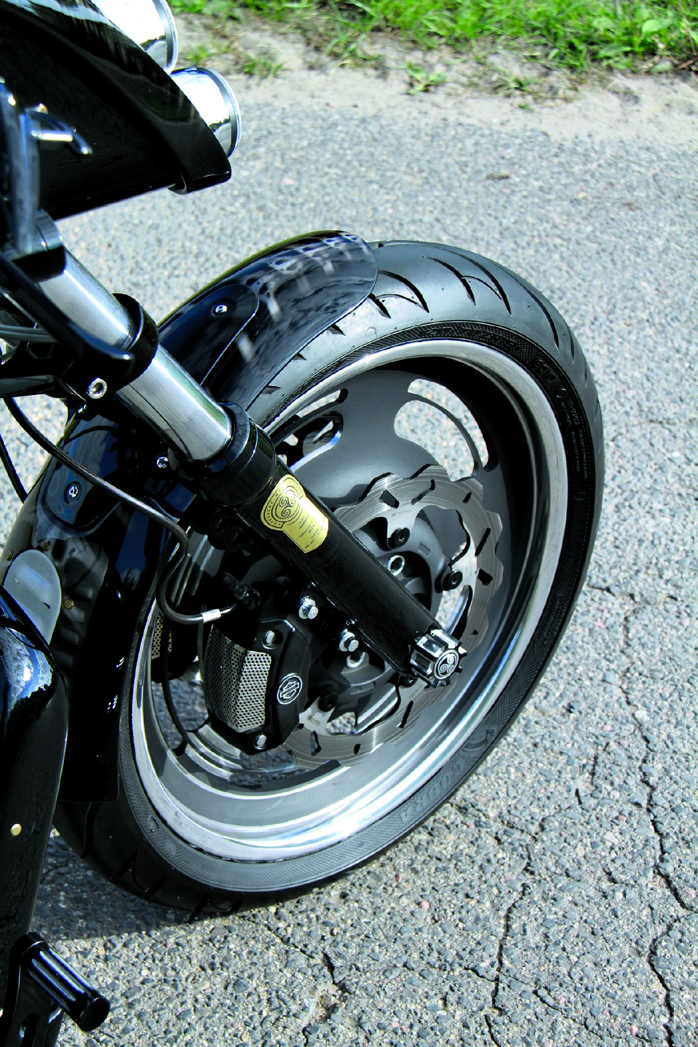 Seryjne koła Harleya zostały zmodyfikowane na obrabiarce CNC. Na tylne naciągnięto nieco szerszą oponę (250 mm). Jeśli spojrzycie na „Nimroda” z tyłu, dostrzeżecie drugi, wewnętrzny błotnik, przymocowany do wahacza i – jak wiele innych elementów maszyny – także ozdobiony nacięciami w postaci skrzeli.