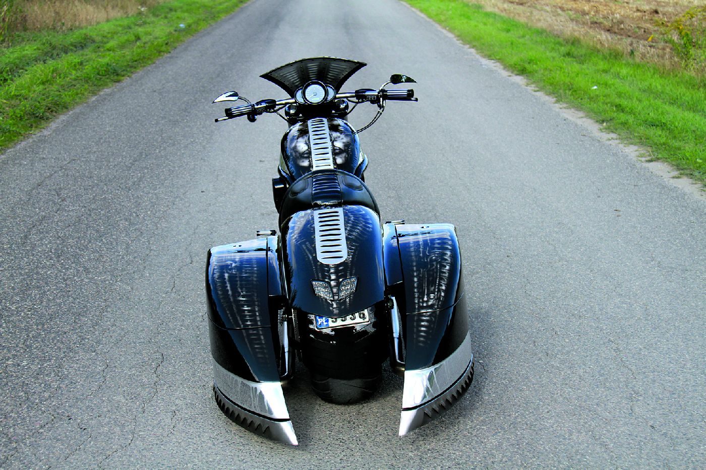 Karoseria została wykonana z blachy aluminiowej przy użyciu dawnych, rzemieślniczych metod. W oczy najbardziej rzuca się tylna część – połączenie obszernego błotnika o łukowych krzywiznach z zachodzącymi daleko za tylne koło bocznymi kuframi, w których odnajdziemy te same krzywizny co w błotniku. To właśnie tylna partia motocykla najbardziej fascynuje, choć mnie nie kojarzy się z potworem z „Obcego”. A tak mówiąc bez ogródek, nie przepadam za sztuką Gigera (to bardzo delikatnie powiedziane). Mnie tylna cześć karoserii przypomina ptaka, który właśnie wylądował i nie zdążył jeszcze całkiem złożyć skrzydeł.