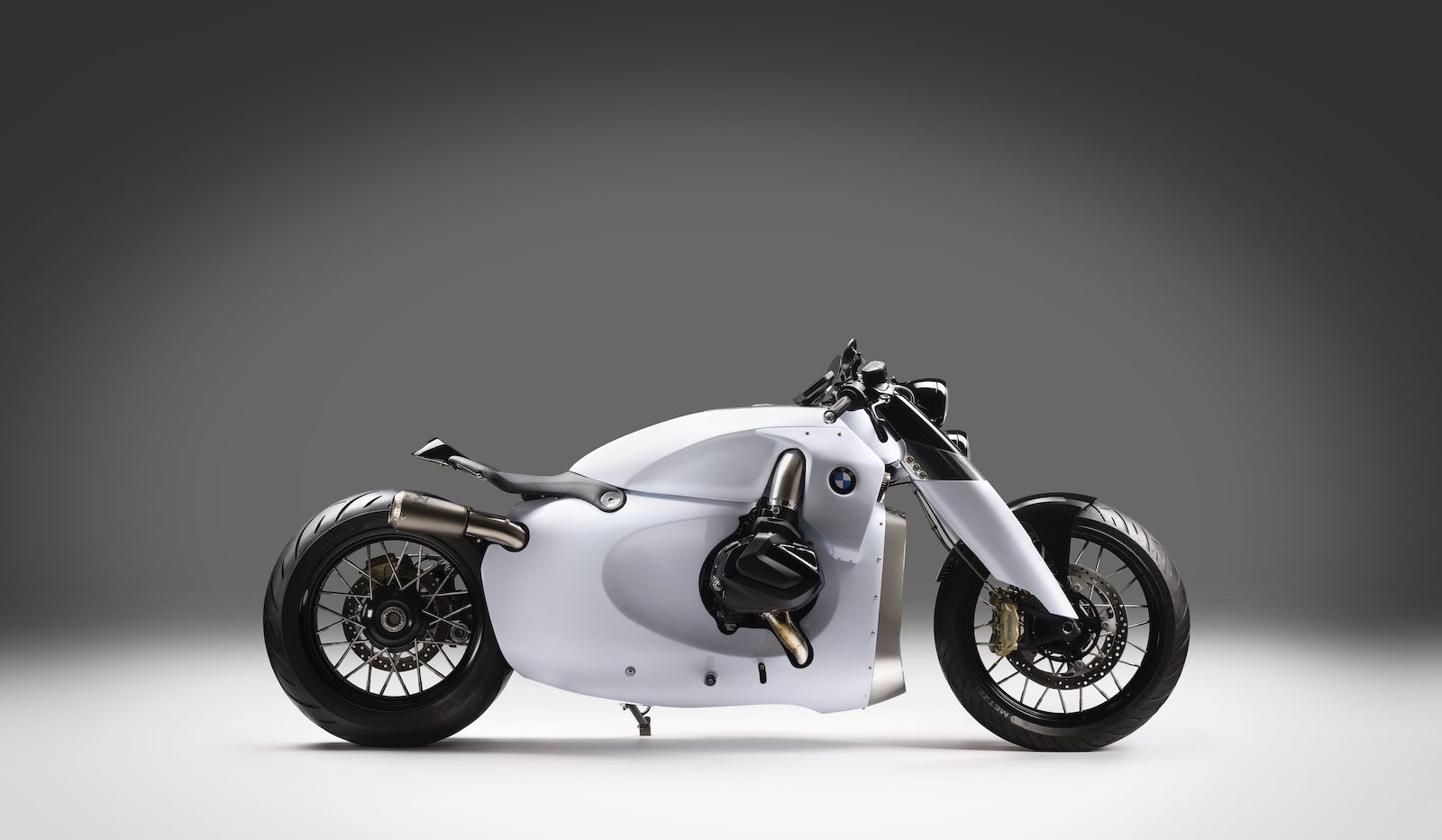 W przedniej części motocykla wzrok przyciągają wydrukowane technologią 3D osłony zawieszenia, dwa reflektory i wycięta na obrabiarce CNC z jednego kawałka aluminium, osłona chłodnicy. Te elementy, w połączeniu z wielkimi filtrami K&N, rurami dolotowymi i wyeksponowanymi cylindrami boxera, nadają motocyklowi muskularnego charakteru. Felgi pochodzą z oferty włoskiej firmy JoNich Wheels, lusterka od Motogadgeta, a reszta osprzętu to seryjne BMW, bo budowniczym zależało na tym, by wszystkie nowoczesne systemy wspomagające działały bez zarzutu. Kolorowy ekran jest dość kontrowersyjny, ale i tak wygląda o niebo lepiej, niż zegary z KTM-a w Lotusie C-01.