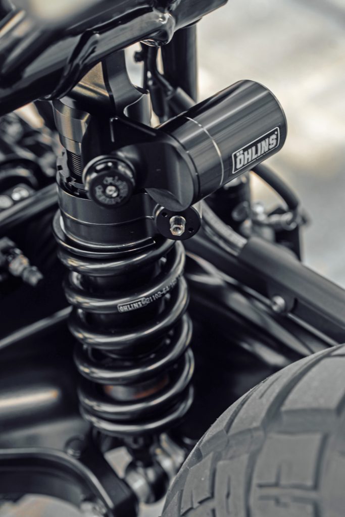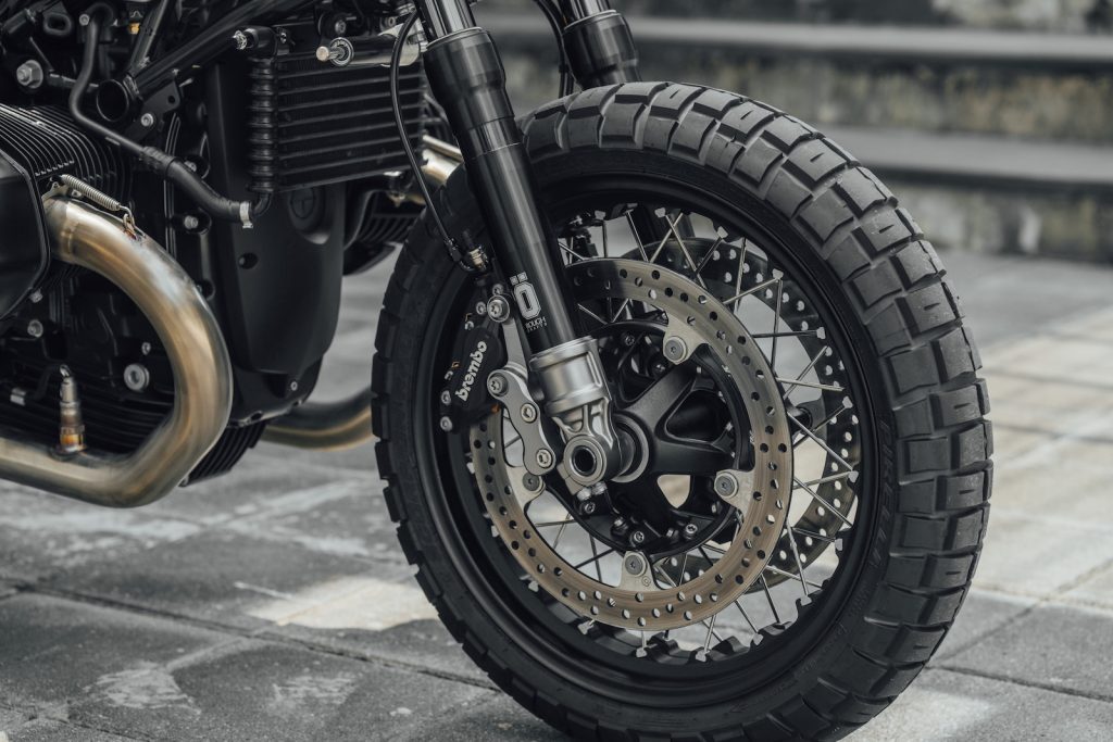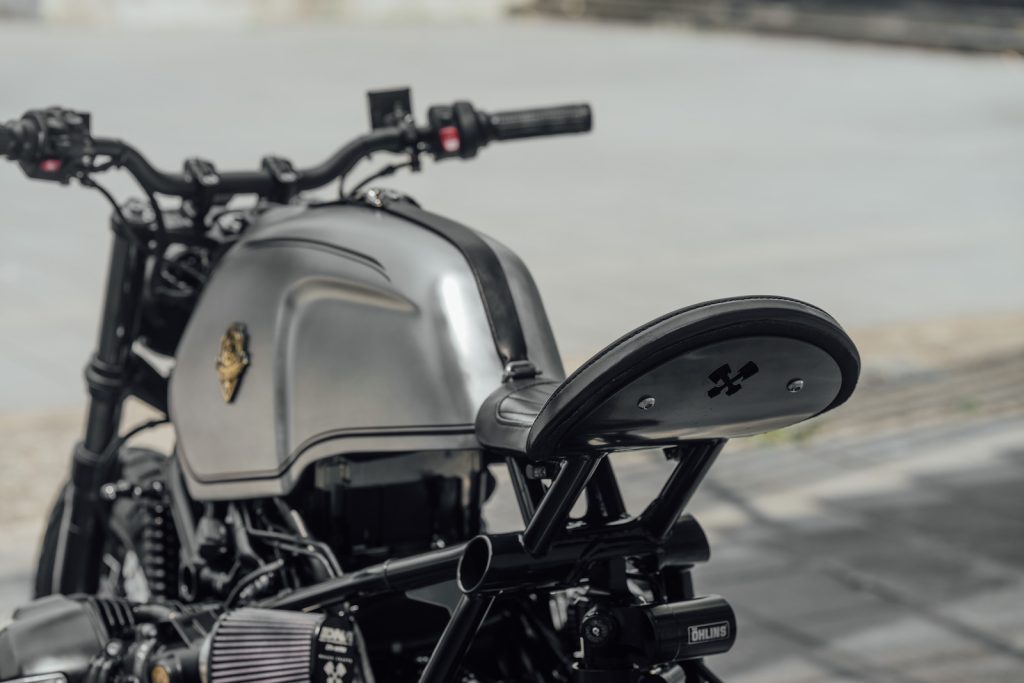 Rama pomocnicza w tym motocyklu nie występuje. Zamiast niej jest proste mocowanie pojedynczego siedziska, czerpiącego inspiracje z motocykli BMW z lat 50. Kolejna charakterystyczna zmiana to zawieszenie. Z tyłu pracuje monoshock Ohlins BM510, z przodu widelec Ohlins FG621 z zaworowaniem marki Andreani. Oba oczywiście polakierowane w mroczną czerń.