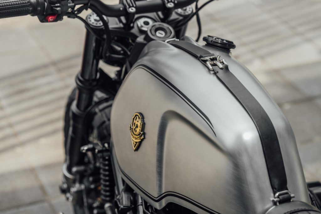 Zbiornik paliwa to kwintesencja stylu Rough Crafts. Jest smukły, minimalistyczny, nawiązuje do historycznych modeli BMW, ale i do R nineT „Bavarian Fistfighter” przebudowanego przez Winstona w 2016 roku. Surowy styl zbiornika świetnie uzupełnia skórzany pasek Urban Soul Leathers, autorski korek wlewu, oraz złote emblematy Rough Crafts.