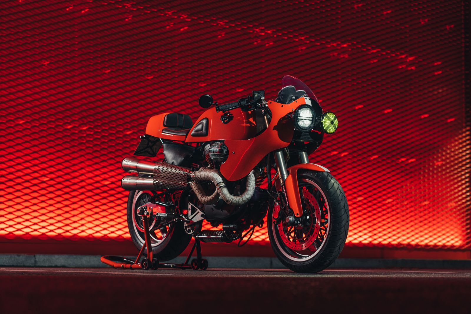 Sam budowniczy opowiada: „Inspiracją były oficjalne kolory wyścigowych motocykli Harleya. Chciałem stworzyć motocykl typu double face, inspirowany Harleyem VR1000”. Tak powstał klasyczny cafe racer, w którym dosłownie wszystko: rama, silnik, owiewki, a nawet zaciski hamulcowe, jest polakierowane z jednej strony na czarno, z drugiej na pomarańczowo.