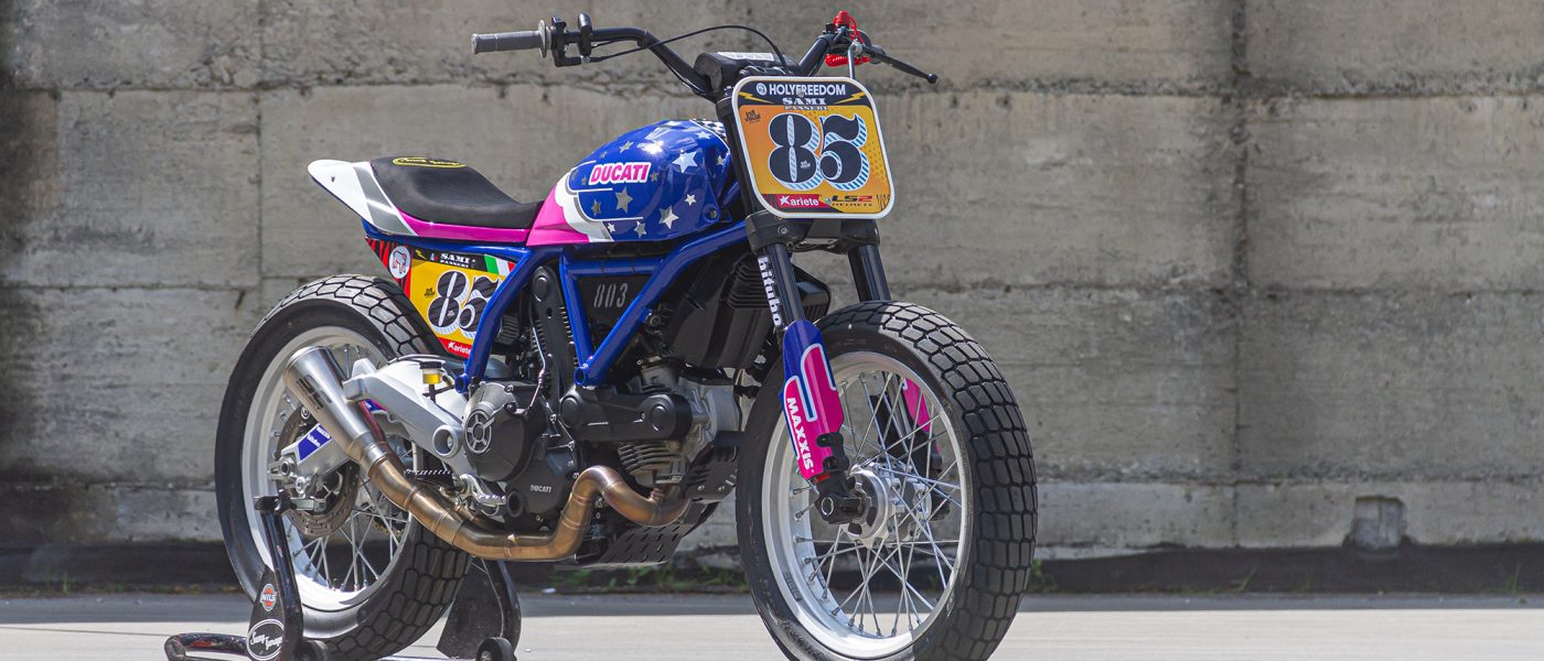 Srebrne gwiazdy to hołd dla USA – kraju, w którym ten sport zyskał największą popularność. Centralna części zbiornika z szachownicą to odniesienie do motocykli z okresu 1960-1970. Flat trackowy Scrambler Ducati wygląda jak maszyna żywcem wyciągnięta z pokazów Evela Knievela – nikt nie przejdzie obok niego obojętnie, szczególnie gdy skopie tyłek „typowym” sprzętom wykorzystywanym w tym pięknie szalonym sporcie.