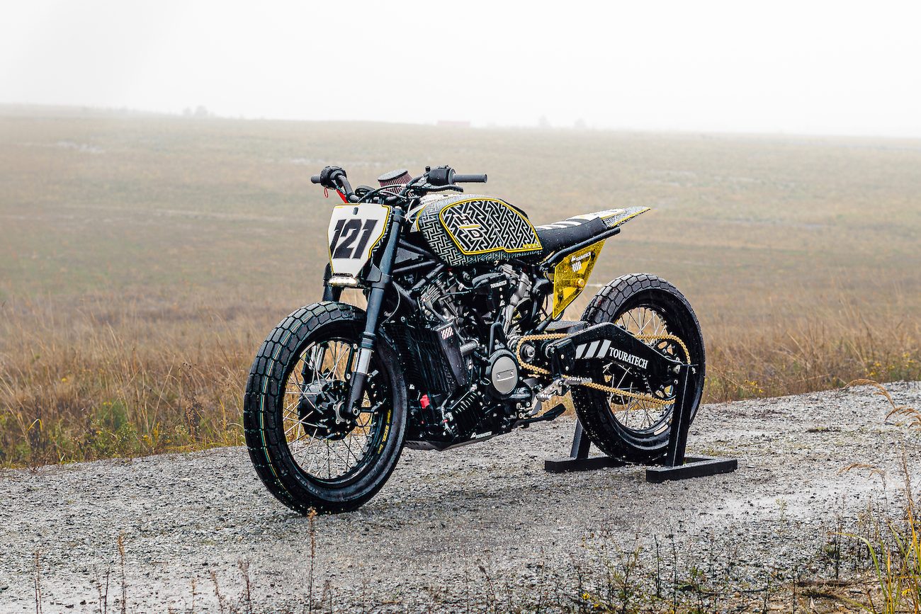 Po intensywnej burzy mózgów budowniczy zdecydował, że z motocykla typu adventure zrobi sprzęt do flat tracka. Nie street trackera, jedynie wyglądem przypominającego wyścigówkę do jazdy w kółko, a pełnoprawny sprzęt nadający się do profesjonalnych startów. Wysoce prawdopodobne, że burza nie była tylko w mózgu, ale i w wątrobie, bo Pan America ma tyle wspólnego z flat trackiem, co ja z baletem.