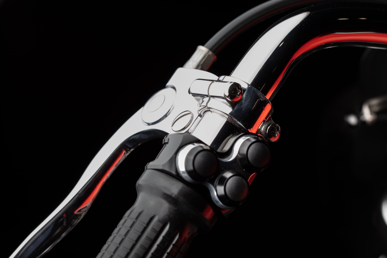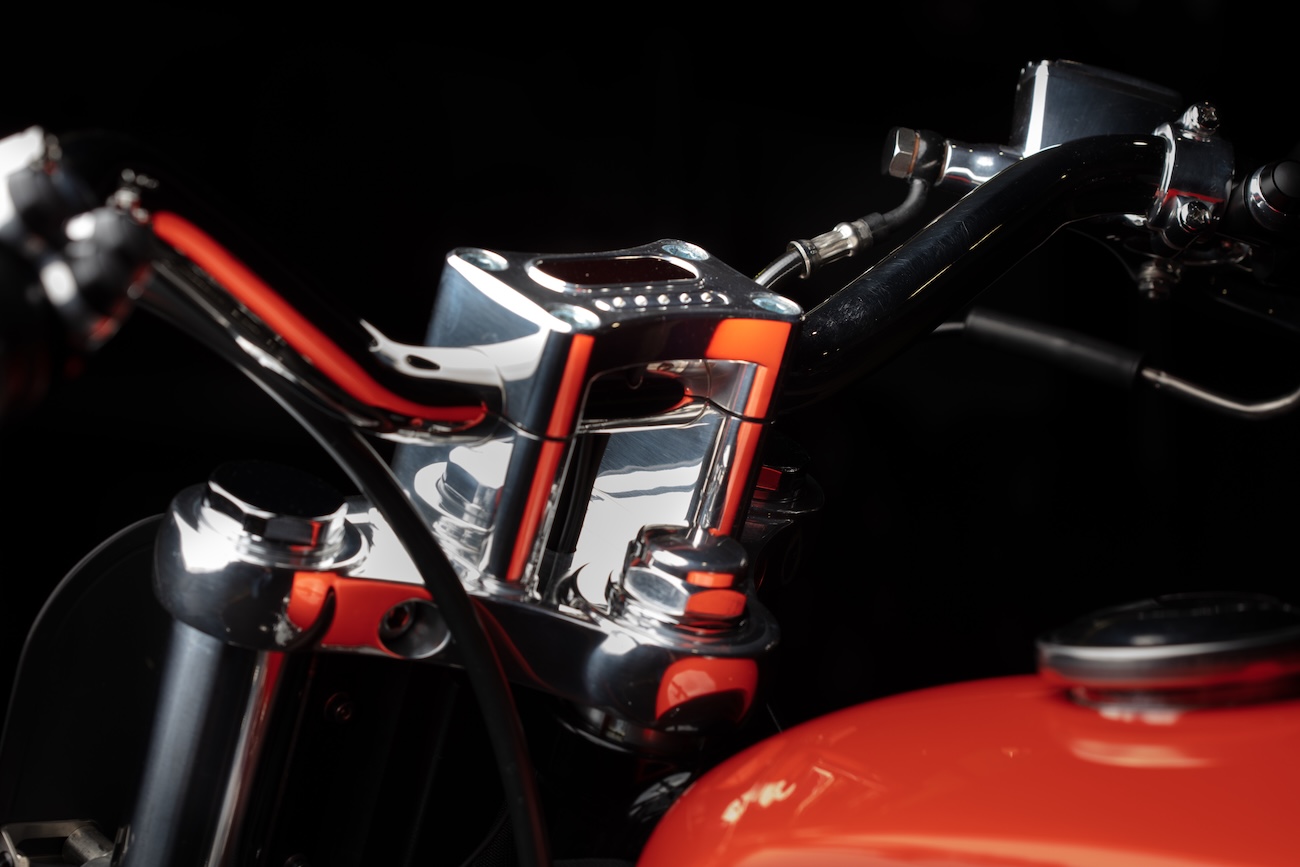 Przedni widelec w stylu Ceriani z niestandardowymi wkładami Monotube współpracuje z szeroką stalową kierownicą z minimalistycznym zegarem od Motogadget. Manetka gazu z pojedynczą linką pochodzi od Prism Supply Co., a polerowane na wysoki połysk kontrolki i przyciski to produkty z oferty wymienionego wcześniej niemieckiego Motogadgeta.