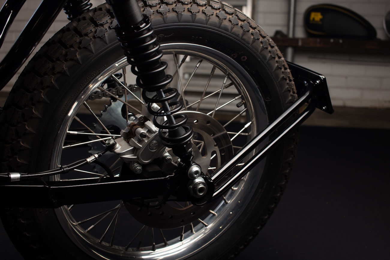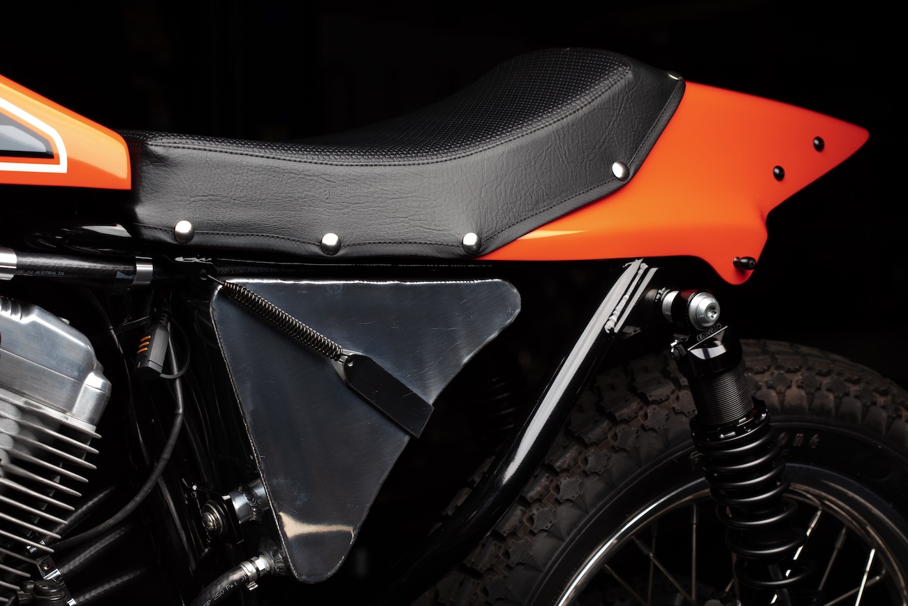 Oryginalna rama pomocnicza została zmodyfikowana pod zestaw 15-calowych amortyzatorów YSS. Wisienką na torcie jest wierna replika zbiornika oleju. Co ciekawe, w motocyklu działa oryginalny ABS, immobilizer, a nawet system bezkluczykowego zapłonu, a dzięki reflektorowi LED, kierunkowskazom Kellermann i ukrytej tylnej lampie, motocykl jest w pełni przygotowany do jazdy po drogach publicznych.