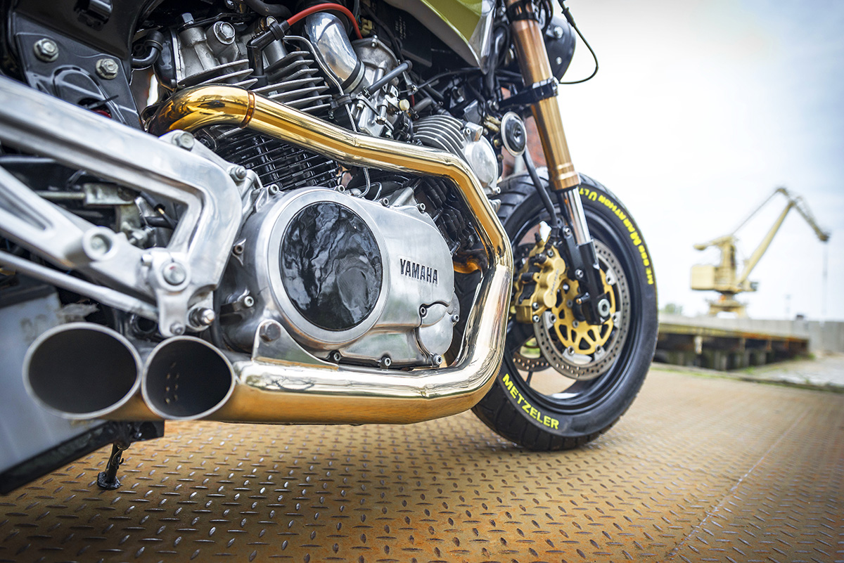 Podczas budowy motocykla dużo uwagi poświęcono układowi wydechowemu. Właściciel upierał się przy konstrukcji z podwójną końcówką, co nie do końca pasowało do wizji budowniczego, który proponował prostsze rozwiązanie. Koniec końców stanęło na wersji tego pierwszego. Klient nasz pan!
