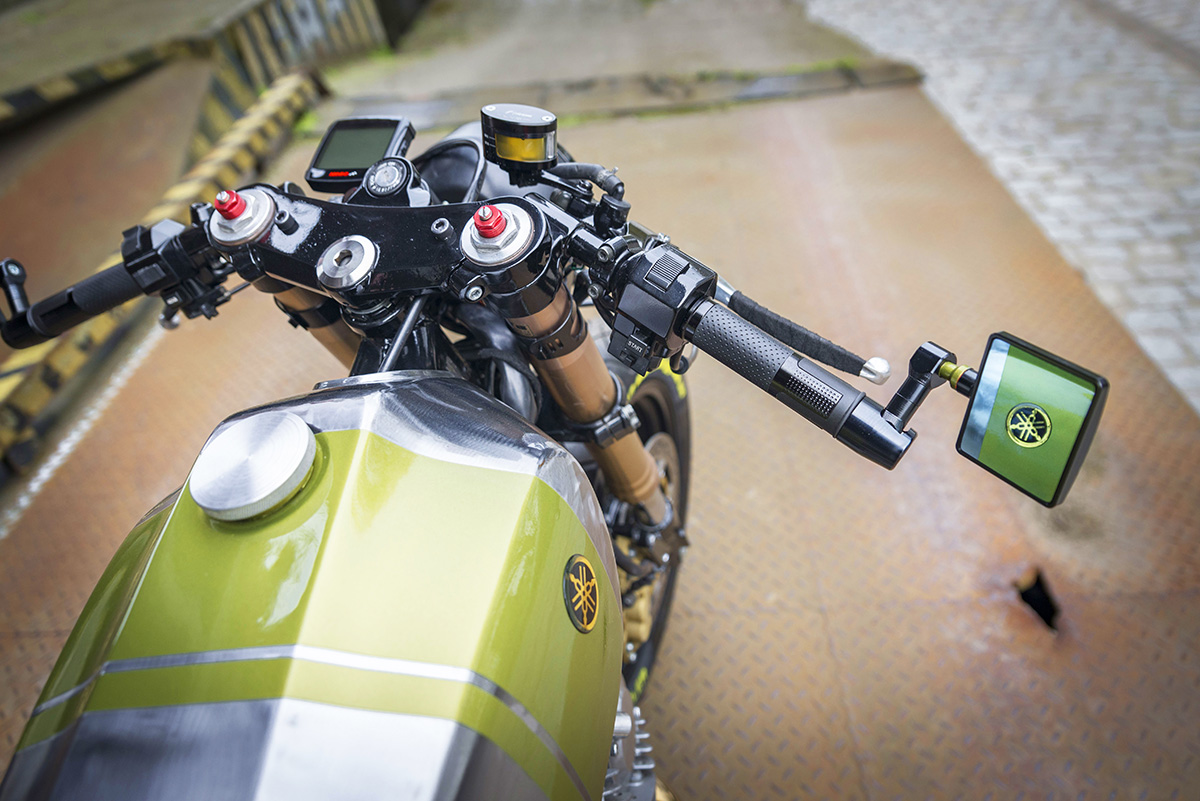 Na końcówkach clip-on-ów pojawiły się stylowe lusterka z detalami w kolorze oliwkowym, a wysłużone, gumowe manetki zastąpiono nowymi z oferty włoskiej Rizomy. Gdyby ktoś doszukiwał się akumulatora to właściciel Ugly Motors sprytnie ukrył go pod wahaczem. Na koniec na seryjne felgi naciągnięto opony Metzeler ME888.