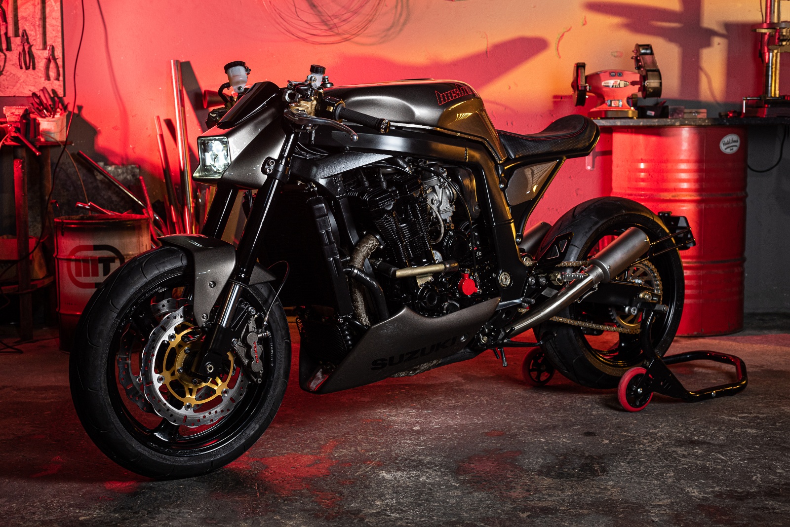 Przedni błotnik o ostrych liniach, pług pod silnikiem i wykończenie ciemnoszarym lakierem z subtelnymi czerwonymi detalami to elementy podkreślające bezkompromisowy charakter maszyny. Ten oldschoolowy streetfighter to wiadomość dla Suzuki: obudź się samuraju z Hamamatsu, bo małe warsztaty z Europy robią lepszą robotę niż twoja armia inżynierów i projektantów!