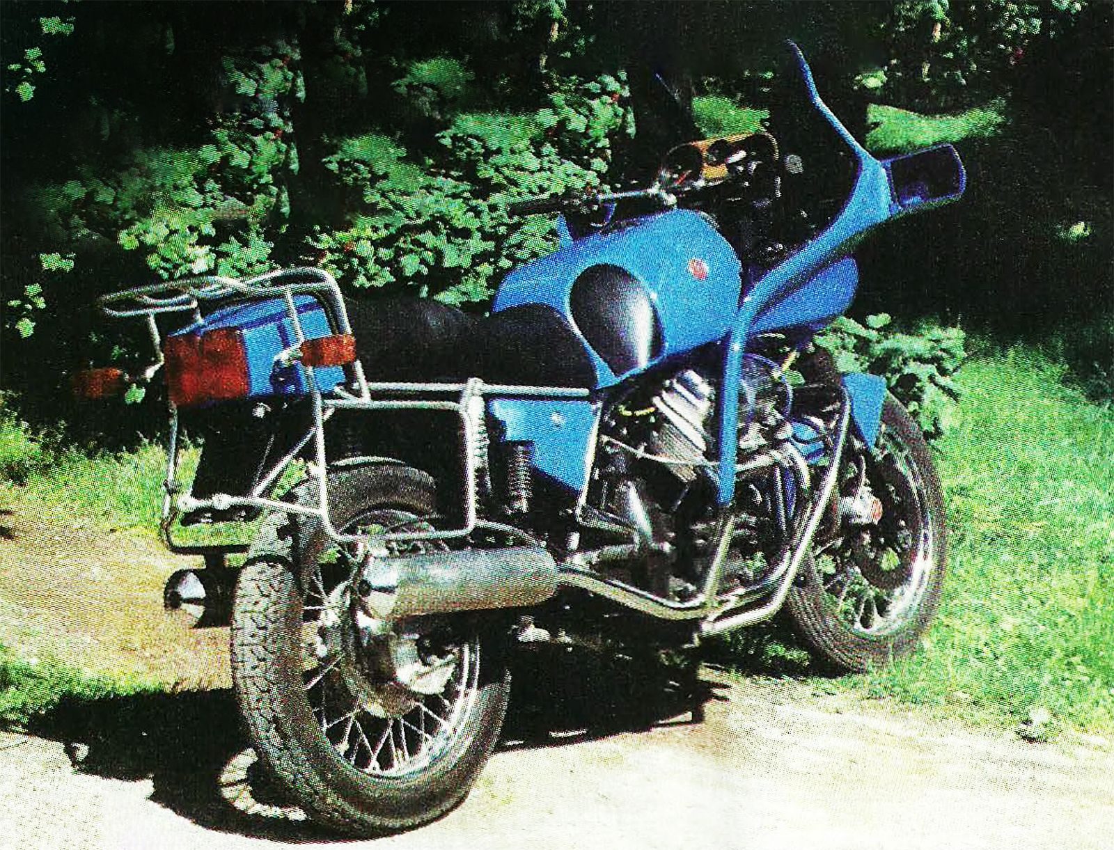 Do pokazania mojego motocykla zainspirował mnie artykuł we wrześniowym ŚM, dotyczący połączenia ramy R-35 i silnika z „japończyka”. Jest to pojazd ładnie wykonany, ale nie życzę jego właścicielowi odbycia dłuższej podróży np. tygodniowej – leczenie pewnej części ciała murowane, ze względu na sztywne zawieszenie tylnego koła i ubogą kanapę. Ale do rzeczy. Moje „wozidło” ma nazwę TM, „turystyczny motocykl” – to oficjalnie, a nieoficjalnie TM to Tadeusz i Marta (moja żona). Maszyna posiada silnik Zaporożec BE o mocy 50 KM. Gdy go kupiłem (z przebiegiem 2000 km), był zatarty. Jest to najsilniejsza wersja silnika, która ma stopień sprężania 8,4 i gaźnik od samochodu Lada 2105 (dwugardzielowy). Po remoncie i ingerencji w jego wnętrze: zmianie tłoków na PF 126p, ważeniu korbowodów, zmianie i korekcji kanałów dolotowych, zmianie wału rozrządu, przekonstruowaniu klawiatury, zmianie koła zamachowego na lżejsze stalowe, wyważeniu dynamicznym wału korbowego wraz z kołem zamachowym, zmianie sprężyn zaworowych, polerowaniu części – silnik był sprawdzany na hamowni (hamulec wodny HO Junkersa) i osiągnął moc ok. 65 KM przy 6500 obr./min.Napęd z silnika jest przenoszony przez sprzęgło jednotarczowe sterowane mechanicznie, docisk sprzęgła pochodzi z samochodu Wartburg. Skrzynie – odlewane ze stopu AK9. Wnętrze jest całkowicie nowe, wykonane na wzór Urala, jednak o innych przełożeniach. Napęd wałem z przegubem Kardana przy skrzyni i przegubem PF 126p przy przekładni głównej. Wał napędowy i krzyżak zostały wykonane w całości jako nowe. Czopy krzyżakowe mają średnicę 12h7, zamiast śr. 10 +/- 0,1, ponieważ z taką tolerancją są wykonywane części radzieckie. Przekładnia główna pochodzi z Dniepra (obudowa), natomiast pokrywa wzmocniona odlewana. Koła zębate 9/35 wykonane na obrabiarce sterowanej numerycznie (piękne). Rama – spawana w całości z rur śr. 32 bez szwu oraz śr. 25 bez szwu. Zawieszenie przód: teleskop z tłumieniem olejowym, tył: wahacz i dwa teleskopy z regulacją sztywności i siły tłumienia. Hamulce przód: hydrauliczne dwutarczowe, zacisk i tarcze odlewane, zacisk skonstruowany na klocki Skody 120, tarcze staliwne śr. 280. Tył: hydrauliczny, średnica bębna 200 mm, szczęki z Zaporożca. Nadwozie wykonane z żywic poliestrowych zbrojonych włóknem szklanym. Zbiornik jest metalowy. Koła mają po 18 cali, koło tylne w nowym sezonie będzie posiadać inny bęben i proste szprychy. Układ wydechowy wykonany jest jako kolektor stalowy o średnicy 38 mm; tłumik tytanowo – aluminiowy, absorpcyjno-rozprężny. W celu maksymalnego zwiększenia funkcjonalności motocykl wyposażyłem w kufry boczne Moto Guzzi, wózek wleczony (1 koło) Niewiadów, torbę na zbiornik Levior oraz worki na bagażnik w motocyklu i wózku. Zdjęcia, które załączam, nie pokazują pełnego obrazu motocykla; w momencie robienia zdjęć nie wszystkie detale były zamontowane, np. brak lusterek lub tablic rejestracyjnych czy chłodnicy oleju.