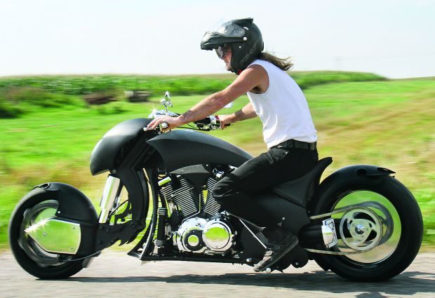 Konstruktor tej niezwykłej maszyny przyciska klawisz na kierownicy. Ciszę poranka przerywa zaśpiew elektrycznego rozrusznika, po czym z trzewi mechanicznego potwora dobiega basowy gulgot widlastego twina. Po naciśnięciu kolejnego klawisza basowi wydechu towarzyszy terkotanie kompresora. Mechaniczne monstrum budzi się do życia, powstając z przyklęku. Najpierw unosi się tył, później przód. Cała procedura przypomina wstającego dromadera. Jeździec zasiada za sterami, wrzuca pierwszy bieg i wytacza się z garażu. Kiedy jest już na prostej, mocniej odkręca gaz i znika.