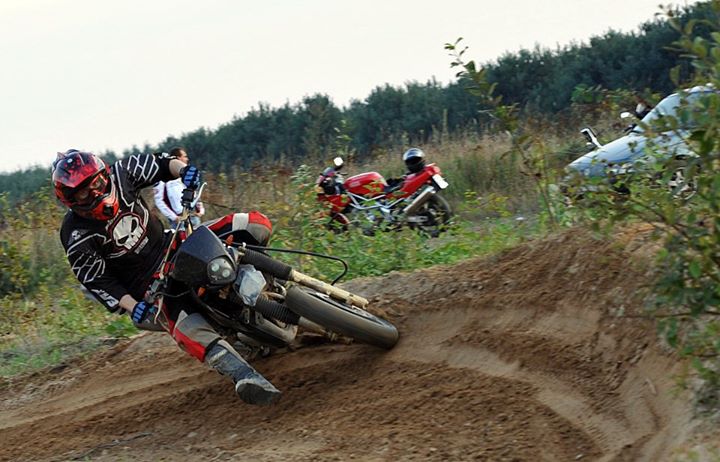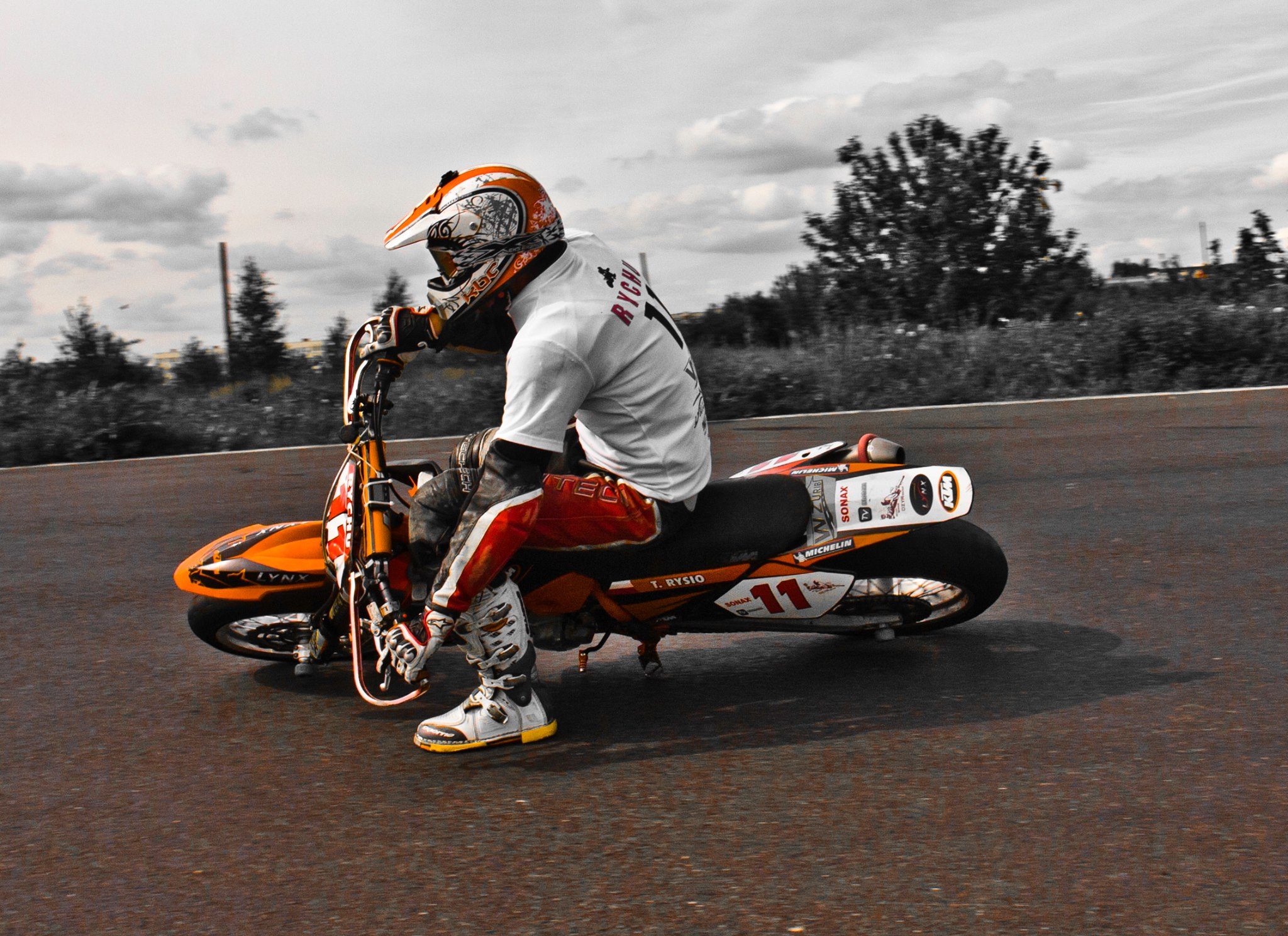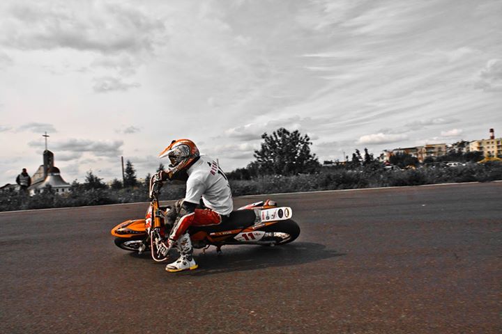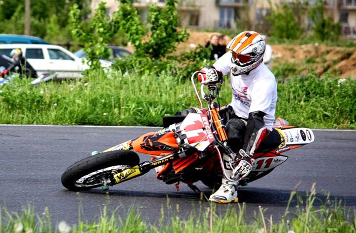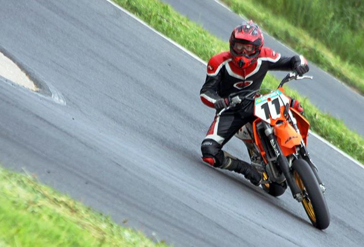 Jazdy po torze nie da się opisać słowami, tego trzeba spróbować. Poczułem adrenalinkę, wkręciłem się do tego stopnia, że następnego dnia kupiłem kombinezon skórzany (wcześniej jeździłem w spodniach i kurtce tekstylnej). Później dość często odwiedzałem Tor Lublin. Przyszedł czas na pierwszą ważną decyzję, czyli zawody 🙂 Pierwszy start zaliczyłem na torze w Biłgoraju. Pamiętam, że na treningach przytrafiła mi się gleba i pękł dekiel, na szczęście ktoś wymyślił poxylinę i mogłem wziąć udział w wyścigach. Byłem przedostatni. Wtedy wiedziałem już, co chcę robić i co mnie kręci. Szybka sprzedaż DRZ i zakup KTM pochłonęły mnie całkowicie i zaczęła się jazda w SUPERMOTO!