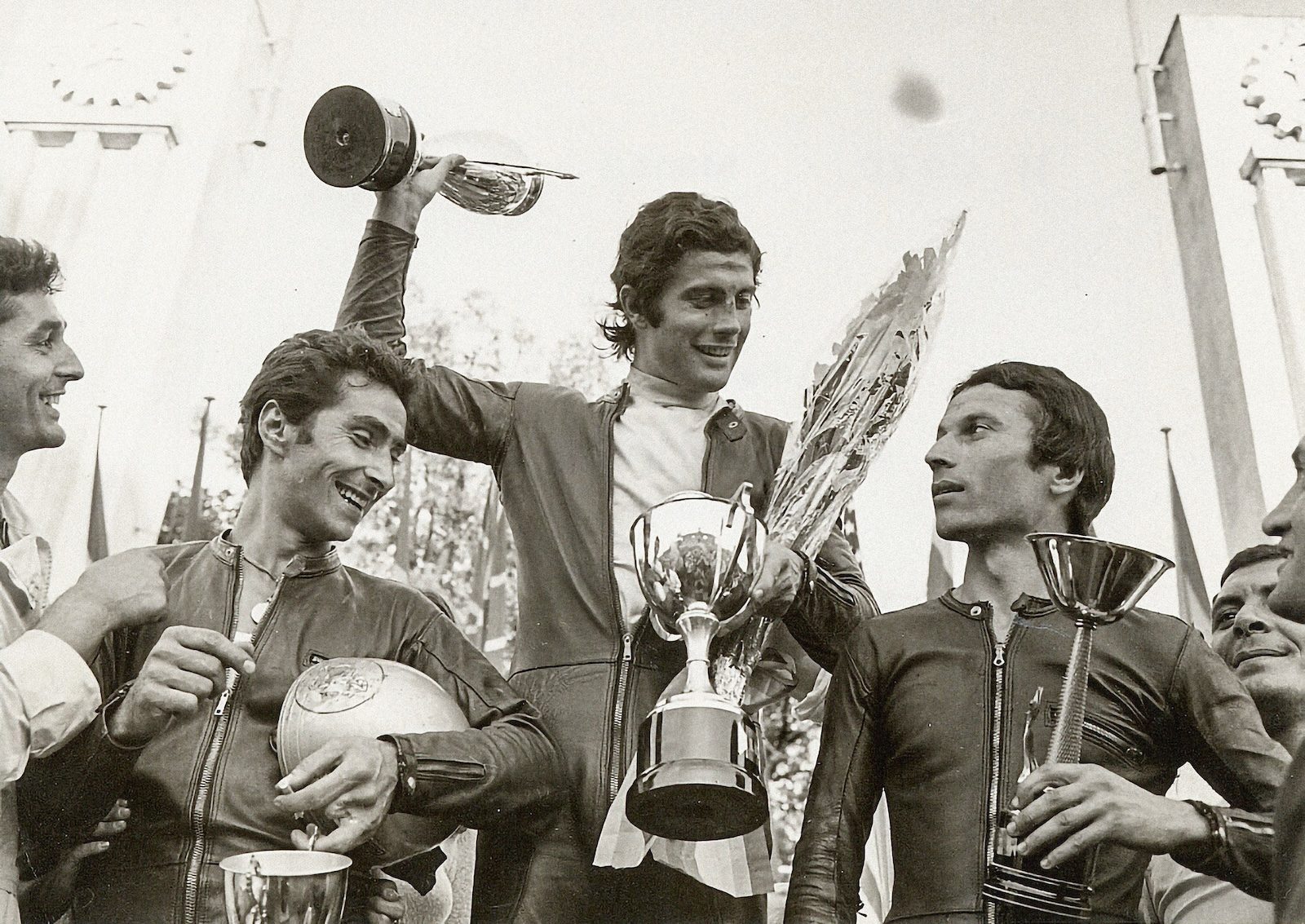 Phil Read, Riccardo Agusta i Giacomo Agostini. 23 tytuły, 174 wygrane i 280 podiów na jednym zdjęciu.
