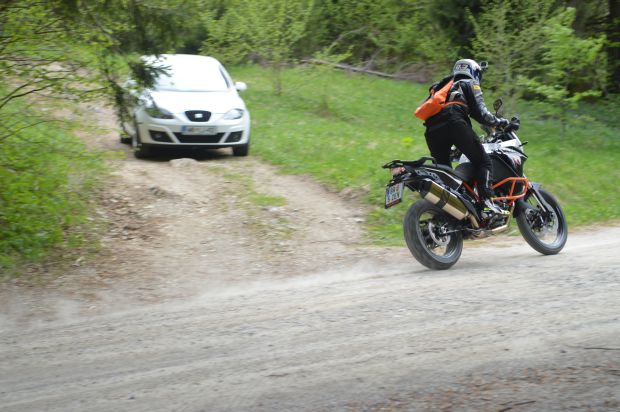 Silnik pochodzi wprost z 1290 Superduke R. Oczywiście, w porównaniu z tym potworem dokonano kilku zmian, których celem było obłaskawienie bestii, lecz jednostka napędowa ciągle generuje 160 KM i 140 Nm! Gdy wyjechałem na autostradę i odkręciłem gaz, KTM wyrwał do przodu z dynamiką maszyn sportowych. Jednak prawdziwe oblicze Super Adventure odkrywamy po zjeździe na drogi lokalne.