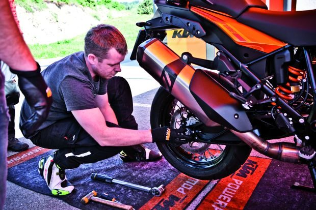 Elementem, który najbardziej odróżnia KTM-a 1050 od rodzeństwa, jest podwozie. Jedynie w centralnym amortyzatorze możemy zmieniać ustawienia (napięcie wstępne sprężyny oraz siłę tłumienia odbicia). Z przodu – żadnych śrubek ani pokręteł. Przynajmniej nie trzeba się głowić, jak się nimi posługiwać.