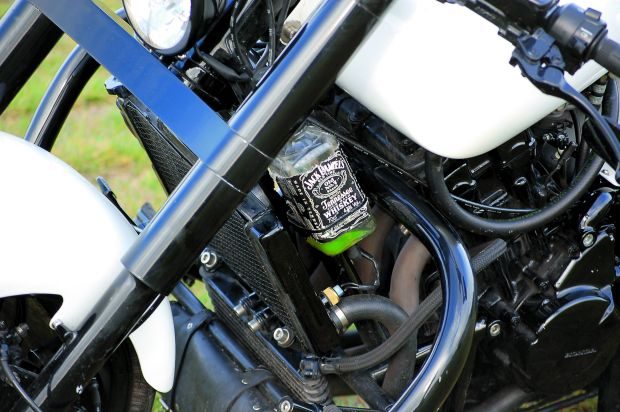 Surowe, niczym nie „upiększone”, biało-czarne nadwozie doskonale dopełnia całość i dodaje powagi i tak już masywnej sylwetce motocykla. Ciekawostką jest zbiorniczek wyrównawczy cieczy chłodzącej, zrobiony z butelki po whiskey Jack Daniel’s. Trwają jeszcze „badania”, czy nie udałoby się tego zasobnika wypełnić płynem w kolorze tejże whiskey, a nie dziwnie wyglądającą w takiej flaszce, zieloną cieczą.