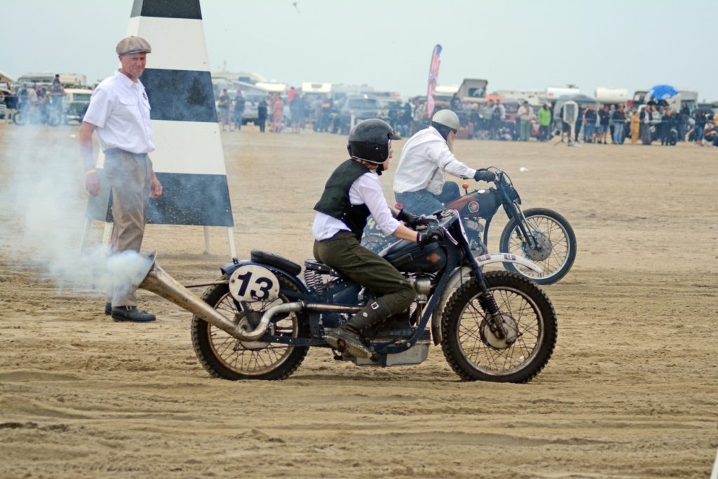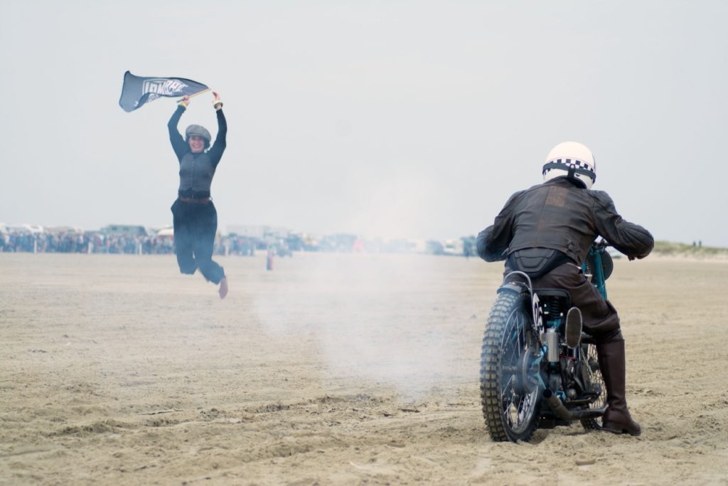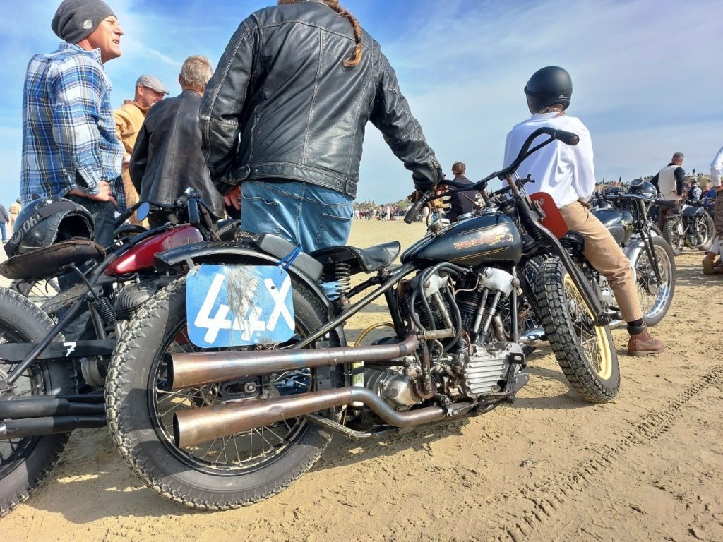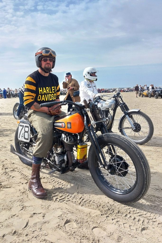 Dzień wyścigów wita nas dobrą pogodą, jest lekkie zachmurzenie z przebłyskami słońca, nie jest upalnie, co na pewno dobrze wpłynie na chłodzone powietrzem silniki. Docieramy na miejsce zawodów, obok innych ekip rozkładamy małe stanowisko serwisowe – stare narzędzia, zabytkowe bańki na olej, metalowe skrzynki narzędziowe. Organizatorzy wyjątkowo dbają o stworzenie niesamowitego klimatu dawnych lat i każdy uczestnik jest zobowiązany do noszenia epokowego stroju. Dotyczy to także również mechaników, całej obsługi, a nawet fotoreporterów obecnych na torze. Część widzów również nosi stroje retro, co jeszcze bardziej podkręca klimat imprezy. Wszystko to wygląda niesamowicie, my jednak, jak na razie, bardziej myślimy o zbliżającym się starcie i skłamałbym, mówiąc, że nie mamy tremy. Pierwszy jedzie Krzysiek, a jego sparing partnerem jest Szwed na sportowej przedwojennej Husqvarnie. Na jego motocyklu emblematy z wyspy Man, bo tam też się ścigał – widać, że to stary wyjadacz, no cóż, nie będzie lekko. Ruszyli ostro, piach spod tylnych kół wzbił się w powietrze. Teraz moja kolej. Maksymalnie skupiam się na dobrym ruszeniu z nożnego sprzęgła – w moim Zündappie jest już bardziej współczesny układ zmiany biegów ze sprzęgłem w lewej ręce i biegami w lewej nodze, w Harleyu Krzyśka jest odwrotnie. Udało się, nie zdławiłem maszyny i tylko widzę jak piasek pod przednim kołem, umyka szybciej i szybciej. Wyścig odbywa się na dystansie 1/8 mili (200 m), ale z pozycji kierowcy to naprawdę spora odległość. Emocje potęguje fakt, że ścigamy się motocyklem na sztywnej ramie, z archaicznym przednim zawieszeniem na sprężynach i praktycznie bez hamulców. Mijam wieże wyznaczające koniec toru i wraz ze ścigającym się ze mną zawodnikiem wracamy już powoli przed wiwatującą publicznością. Wspaniałe uczucie. Podjeżdżamy na start i szukamy partnerów do kolejnego biegu – zawody mają formę prób prędkości w parach i można wystartować dowolną ilość razy. Nam udaje się to kilkukrotnie, po czym następuje koniec zawodów – ogłoszenie wyników i dekoracja zwycięzców. Podium jest poza naszym zasięgiem, ale i tak czujemy się doskonale, pierwszy start na Rømø uznajemy za bardzo udany.
