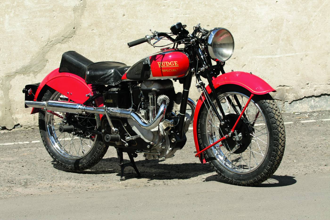 Motocykl, który widzicie na zdjęciach, to Rudge Sports Special – napis na zbiorniku może mylić. W tej wersji dostępny był od 1937 roku. Inaczej niż w modelu Special, miał poprowadzone wysoko rury wydechowe i mniej pełne błotniki (choć nadal masywne i głębokie, nie tak filigranowe, jak w egzemplarzach wyczynowych).