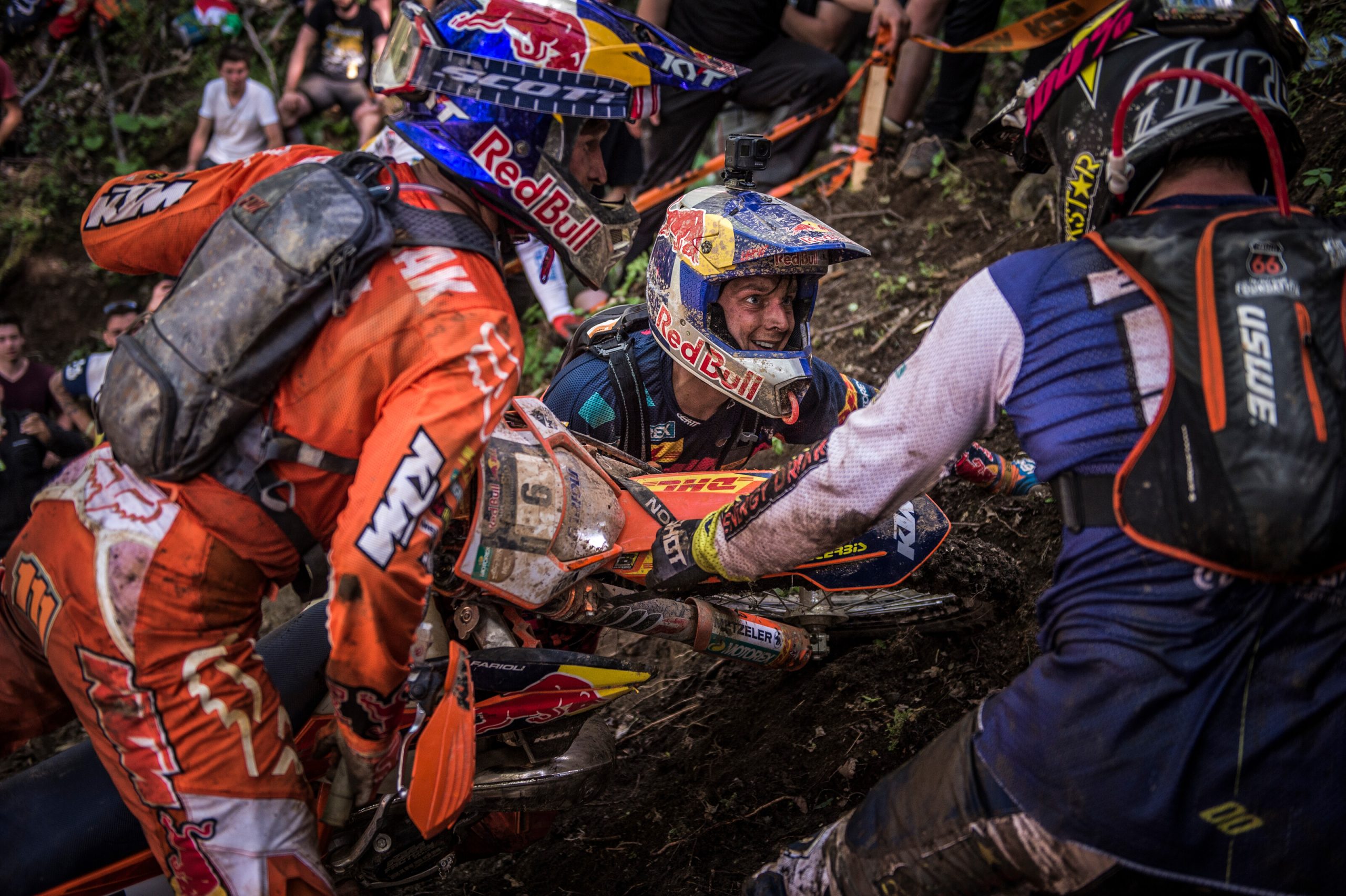 Swoją drugą szansę Mani miał jeszcze w Zielonym Piekle – stromym leśnym podjeździe, na którym Graham Jarvis utknął w połowie drogi. Na tyle jednak sprytnie, że zablokował najlepszą linię przejazdu i Lettenbichler utknął za nim. Gdy Jarvis wydostał się z 20-tego Check Pointu pełnym gazem ruszył w stronę mety, z dziecinną łatwością wjeżdżając pod ostatnie trudne podjazdy. Dzięki niewielkim problemom Manuela pod koniec wyścigu, Graham mógł spokojnie świętowac na mecie swoje piąte już zwycięstwo na Erzbergrodeo i wyrównanie rekordu ilości wygranych Tadka Błażusiaka. Lettenbichler zameldował się na drugim miejscu, a podium dopełnił rozkręcający się z biegem wyścigu Mario Roman, który wyprzedził swojego kolegę z zespołu Sherco Wade’a Younga właśnie w Zielonym Piekle.