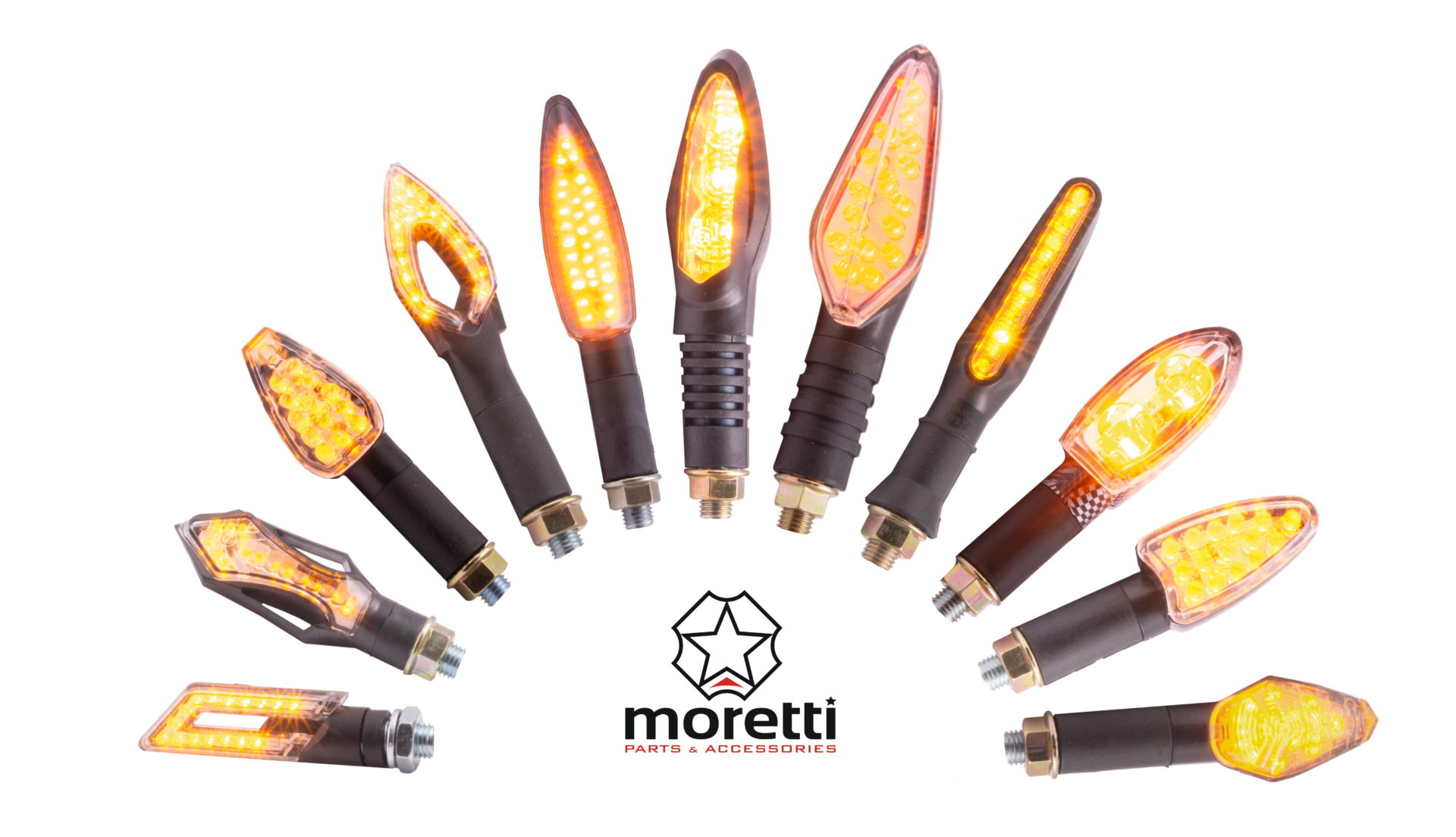 Wszystkie kierunkowskazy LED Moretti posiadają europejską homologację pozwalającą poruszać się po wszystkich krajach wspólnoty. Najbardziej efektowne są kierunkowskazy dynamiczne, wzorowane na technologii spotykanej w najnowszych samochodach klasy premium. Pływające światło sprawia, że zamiar zmiany kierunku jazdy widać z daleka, jest on bardziej czytelny, a samo oświetlenie staje się niezwykle zjawiskowe.