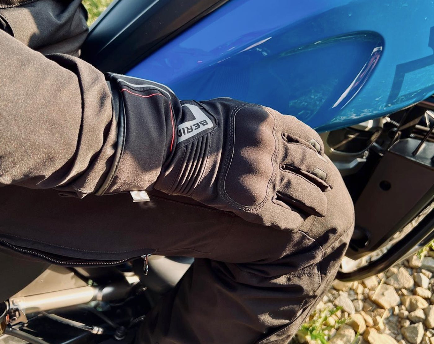 Rękawice wykonane są z miękkiego i przyjemnego materiału softshell, a ich wnętrze obszyte naturalną kozią skórą. W środku wyłożone są ciepłym polarem. Mają wydłużony, regulowany mankiet oraz regulację obwodu nadgarstka. O komfort i bezpieczeństwo motocyklisty dbają wszyta wewnątrz wodoodporna membrana i zestaw certyfikowanych ochraniaczy.