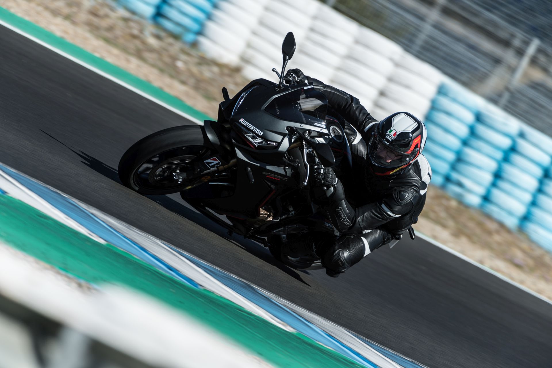 Bridgestone opracował nowy wzór bieżnika, który w założeniu ma lepiej odprowadzać wodę i zapewniać większe czucie motocykla. Sam wzór to jednak nie wszystko. Przednia opona została zbudowana w charakterystyce 3LC, a więc 3 layers compound. Chodzi o to, że mamy trzy warstwy twardości gumy. Pierwsza warstwa to mieszanka twarda na środku oraz 2 warstwy miękkie na bokach opony (oczywiście takie same po obu stronach). Tylna opona to guma składająca się z 5 warstw, czyli tak naprawdę trzech: twarda na środku, bardziej miękka po obu stronach i najbardziej miękka na rantach opony (5 layers compound)