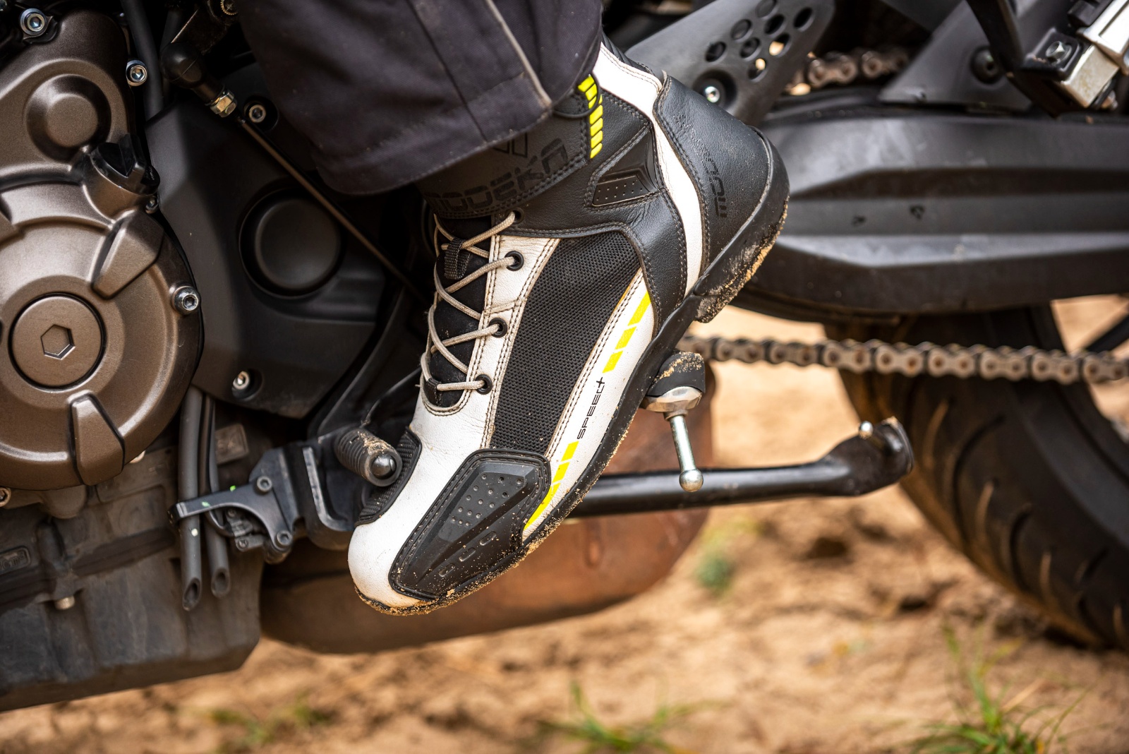 Jest to o tyle ciekawe, że spotkałem się z wieloma niepochlebnymi opiniami na temat butów Modeki. Ale w tym przypadku nie mają one odzwierciedlenia w rzeczywistości. Owszem, nie są to może buty, które wśród fanatyków motocyklowego obuwia budzą pożądanie. Ot, po prostu zwykłe miejskie pantofle za kostkę. Bez membrany, zaawansowanych zapięć czy zawiasów. Zamiast tego są miękkie materiały, usztywniona podeszwa, wzmocnienia na palcach i kostkach oraz osłona w miejscu dźwigni zmiany biegów.