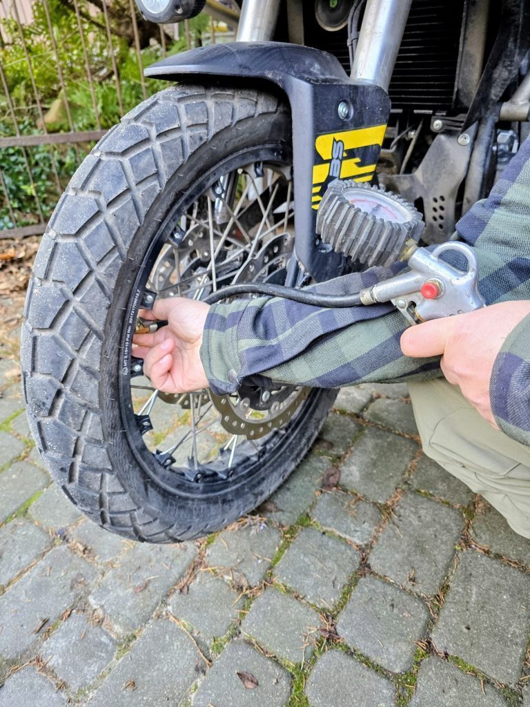 Przed ruszeniem w drogę warto zadbać o kilka spraw. Łańcuch napędowy powinien być solidnie nasmarowany, a ciśnienie w ogumieniu — sprawdzone. Pamiętajmy, że zimą wygląda to nieco inaczej. Nocne, niskie temperatury sprawiają, że wskazania manometru będą niższe, ale po nagrzaniu opon ciśnienie wzrośnie. Sam dałem się na to nabrać kilka dni temu, dopompowując przed jazdą do „prawidłowych” 2,2 bara. Już po kilkudziesięciu kilometrach czujniki sygnalizowały zbyt wysokie ciśnienie i dla uspokojenia sumienia musiałem je nieco spuścić. Gdybym zostawił 1,8 bara, problem by się nie pojawił. Nie pojawi się on również wtedy, gdy twoja maszyna nie jest wyposażona w czujniki ciśnienia, ale tak czy inaczej — dla bezpieczeństwa warto o kontroli pamiętać.