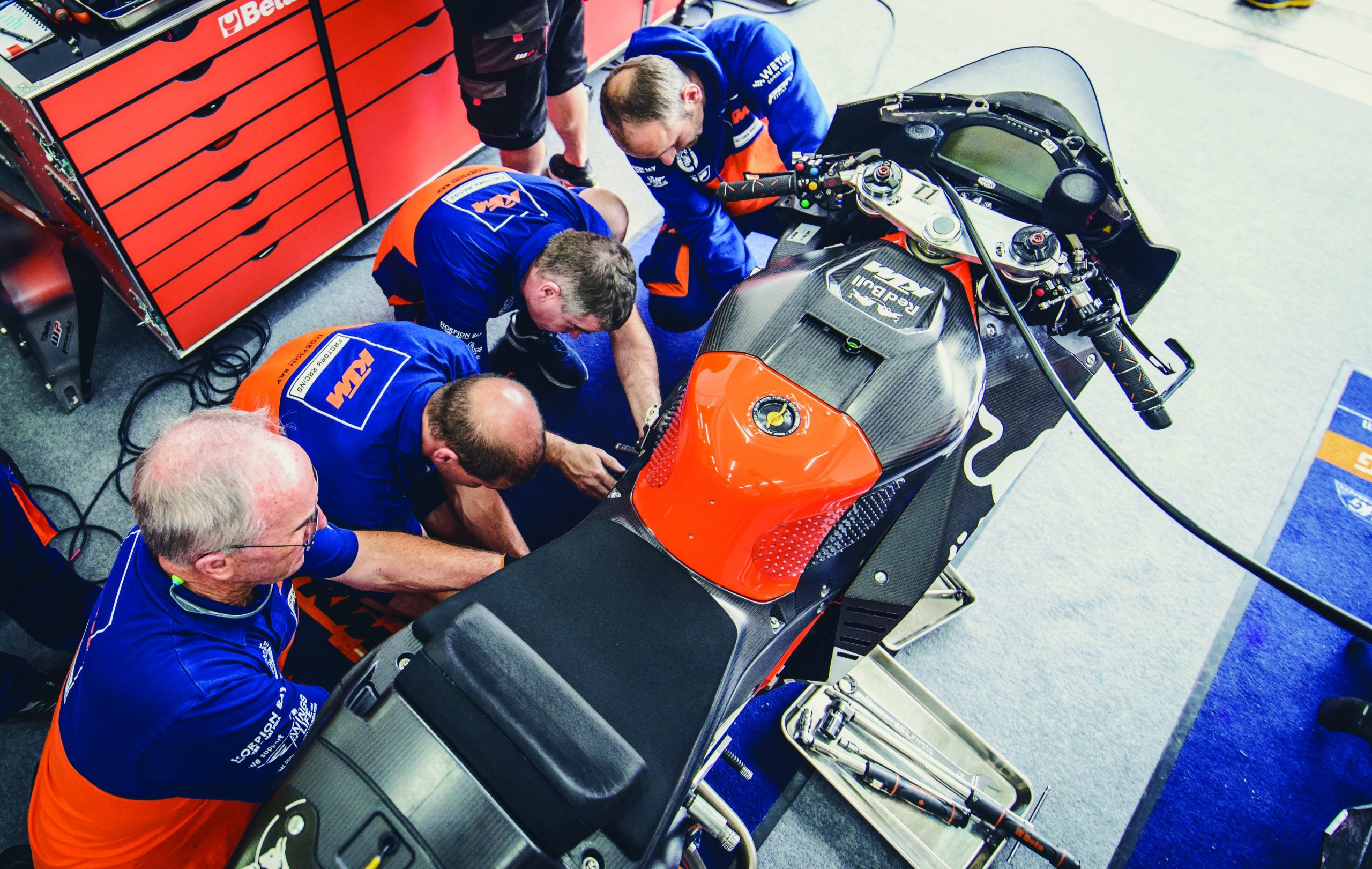 W modelu RSV4, oprócz standardowej już regulacji położenia osi wahacza, do dyspozycji są także regulacja osadzenia silnika w ramie, półki przedniego zawieszenia ze zmiennym osadzeniem czy zmiana kąta główki ramy. Z takim arsenałem geometrię można dopieszczać w nieskończoność i to niemal dosłownie. Uzyskanie zamierzonego efektu, najczęściej wiąże się z długimi testami, zmianą ustawień, dyskusjami i, co równie ważne, analizą telemetrii. Odczucia kierowcy oczywiście są ważne, ale czasem tylko spojrzenie na wykresy pozwala znaleźć słabość danego ustawienia i podpowiedzieć, co należy poprawić.