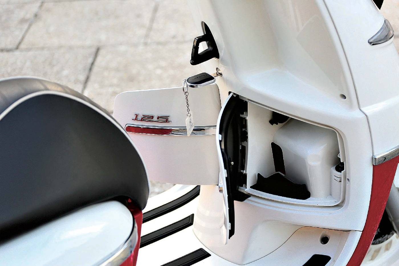 Po przekręceniu kluczyka w stacyjce w lewo otworzymy siedzenie kierowcy, pod którym tradycyjnie znajdziemy schowek na otwarty kask. Natomiast wkładając ów kluczyk do zamka pod haczykiem, otworzymy dwa niewielkie schowki ukryte w panelu przednim. W lewym mamy wlew paliwa, zaś w prawym możemy schować drobiazgi lub podładować telefon. Jest w nim gniazdo elektryczne.