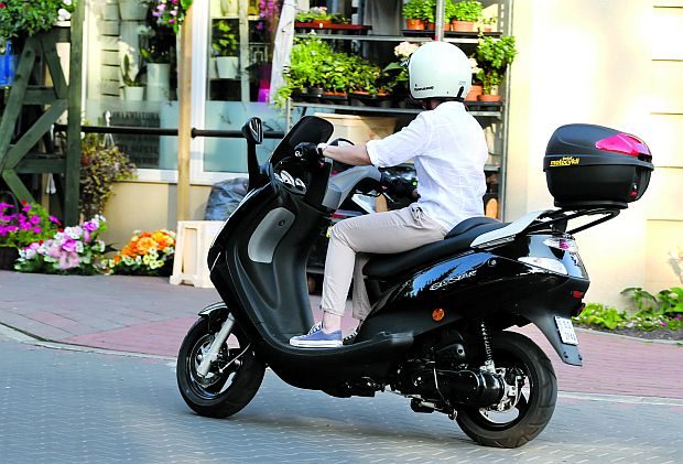 Po kilkudziesięciu metrach spojrzałem na prędkościomierz i przekonałem się, że ten Elystar nie ma blokad. Nikomu nie zawadzam, jadę równo z innymi samochodami, a czasem szybciej od nich. Mimo że skuter jest większy od wielu innych motorowerów, mieści się bez problemu między stojącymi w korku rzędami samochodów. Jest bardzo dynamiczny, zwinny i zwrotny. Ruszając spod świateł, zazwyczaj jestem pierwszy.