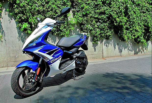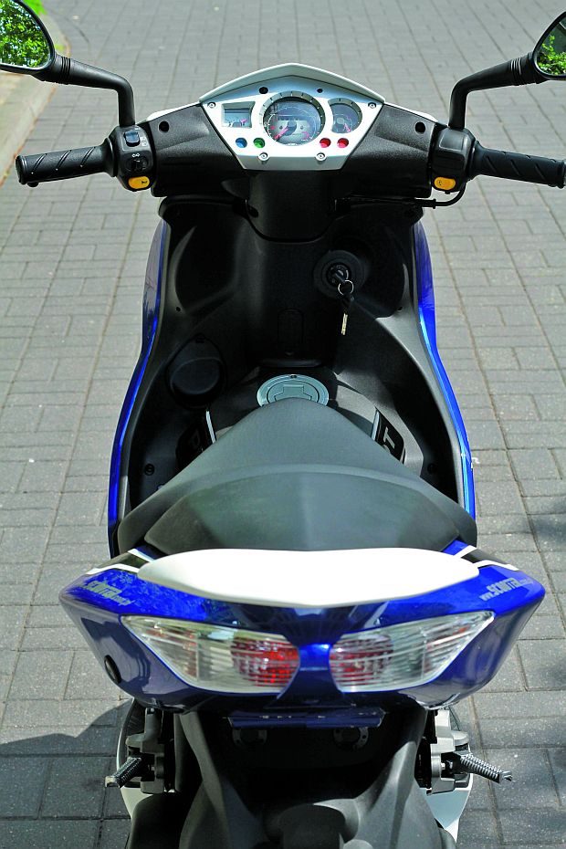 Całość wygląda jak pojazd wzięty z toru wyścigowego, ale czy na pewno jest taki sportowy, na jaki wygląda? Pokaźna jak na motorower masa nie pasuje do skutera o takim charakterze.