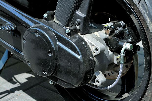 Pozycja za kierownicą jest wygodna. Podesty, ustawione skośnie w dół ku przodowi, umożliwiają przyjęcie wygodnej pozycji krzesełkowej. Na wysokości kostek mamy trójkątne wycięcie osłony bocznej, przez które widać centralny element resorująco-tłumiący. Znajduje się on w połowie długości skutera, przed głowicą silnika i jest połączony systemem dźwigni z zespołem napędowym, stanowiącym również główny element tylnego zawieszenia.