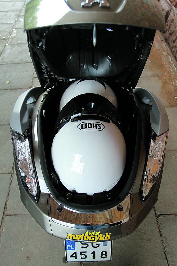 Można go otworzyć kluczykiem w stacyjce bez schodzenia z siedzenia. Dziwnie to zapewnie zabrzmiało, ale otwiera się on jak klapa bagażnika w samochodzie, unosząc się z siedzeniem pasażera. Możemy w nim zmieścić dwa kaski i w głębi znajdziemy jeszcze miejsce na przeciwdeszczówkę.