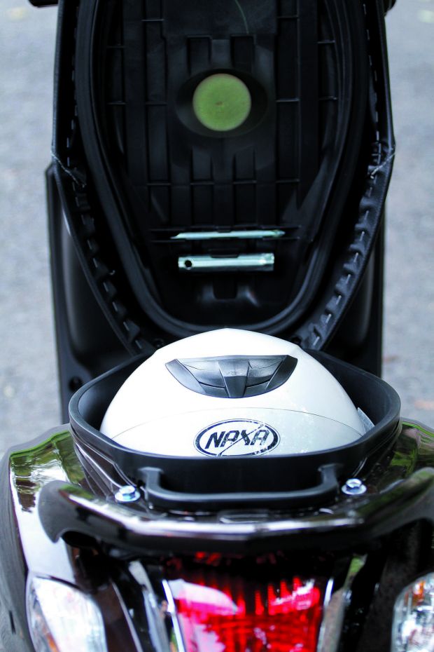 Pod kanapą zmieścimy jeden kask i zostanie jeszcze sporo miejsca na rękawiczki i drobiazgi. Przed prawym kolanem kierujący ma otwarty schowek, gdzie bez problemu zmieści się litrowa butelka z napojem.