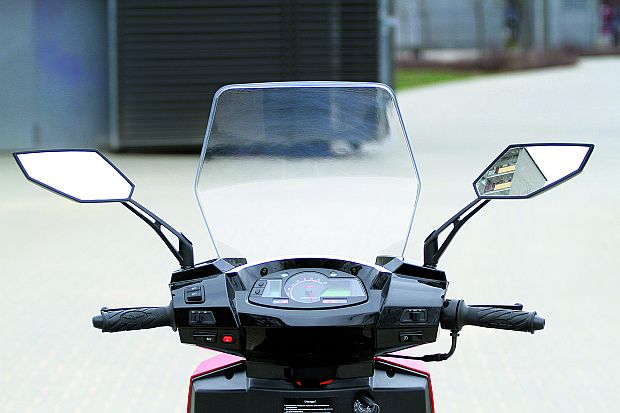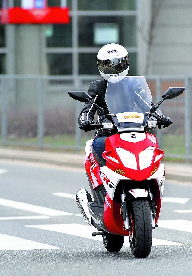 Symbolem nowoczesności są diody LED zastosowane w kierunkowskazach oraz światłach stop i pozycyjnych. Nowoczesne jest też centrum dowodzenia skuterzysty. Analogowy jest tylko obrotomierz, natomiast prędkość, poziom paliwa, przebieg dzienny i całkowity oraz aktualny czas odczytujemy na wyświetlaczu. Osoby będące dalekowidzami mogą być zadowolone z dużych cyfr prędkościomierza. Pozostałe elementy na kierownicy są takie, jak w innych skuterach plus przycisk włącznika świateł awaryjnych. To możemy zaliczyć na mały plus, do dużego plusa zabrakło mu możliwości pozostawienia włączonych awaryjnych po wyłączeniu stacyjki.