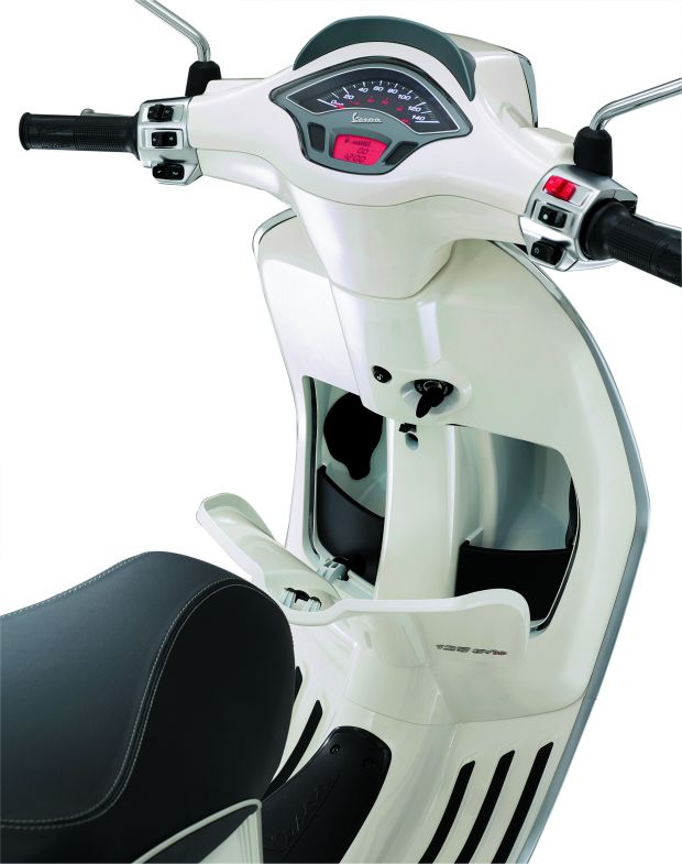 Zmiana lokalizacji akumulatora pozwoliła w Sprincie wygospodarować aż 16,6 l przestrzeni w schowku pod kanapą (Vespa S miała 14,3 l). Teraz bez problemu zmieścimy w nim kask integralny. Jest też dodatkowy, mały schowek w przednim panelu, który możemy otworzyć za pomocą przycisku, gdy kluczyk znajduje się w stacyjce skutera. To bardzo wygodne rozwiązanie. Małą torebkę, dokumenty, portfel czy rękawiczki możemy mieć zawsze pod ręką.