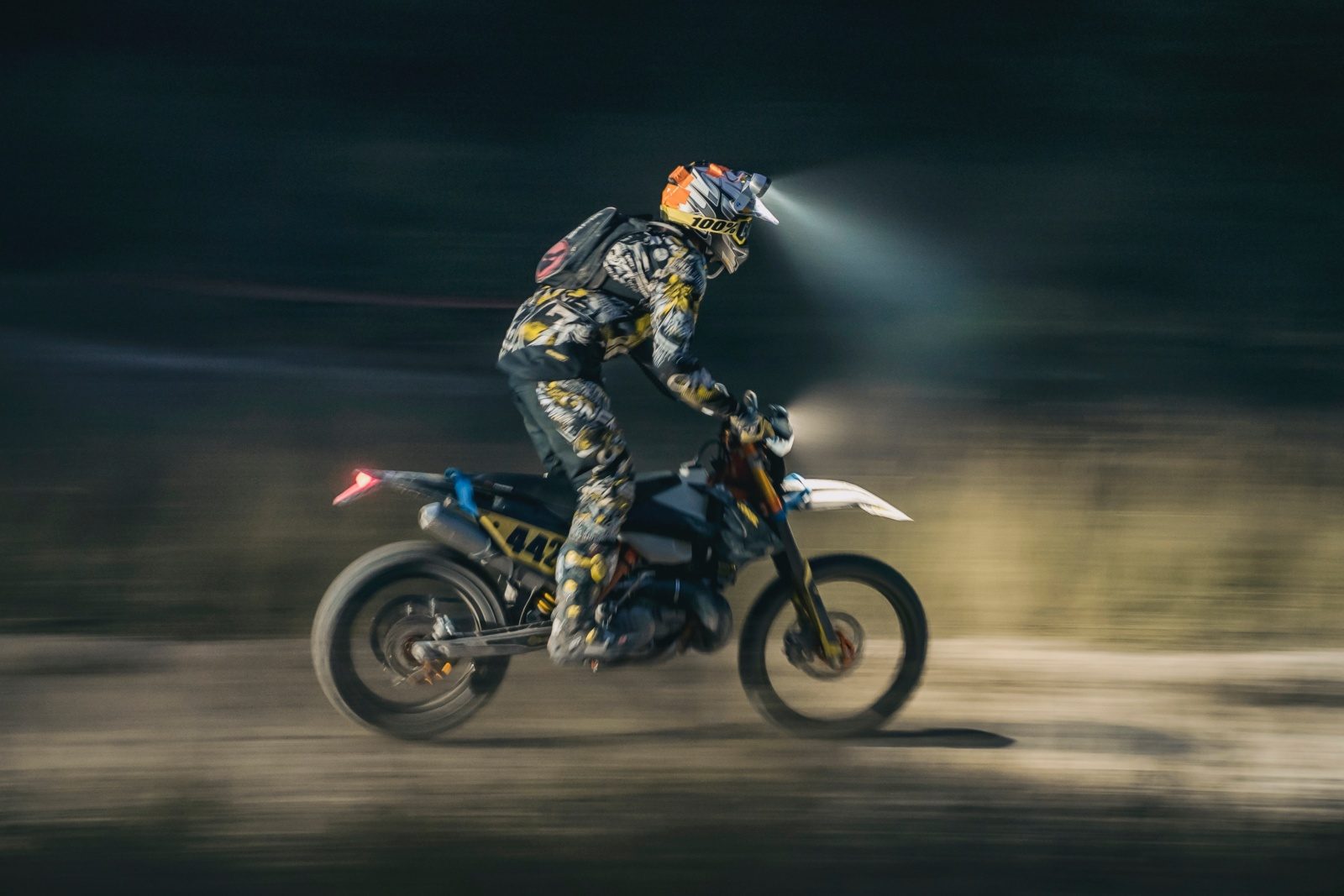 a trochę jednak się obawiałem. Zdarzyło mi się wcześniej jeździć w nocy, ale po dosyć wolnej trasie i bez rywalizacji o przedostatnie miejsce. Z pojedynczym LED-em na kasku i bez lampy na motocyklu czułem się jak rowerzysta z oświetleniem na dynamo, jadący po autostradzie. Nadciągający z tyłu zawodnicy z trzema LED-ami na głowie i kilkoma kolejnymi na kierownicy rozświetlali wąskie ścieżki niczym tiry, i przez chwilę robiło się jaśniej, niż w ciągu dnia. Wtedy mogłem trochę podkręcić tempo, nie zastanawiając się, w którą stronę będzie następny zakręt. Po zjechaniu z trasy po pierwszym nocnym okrążeniu, kiedy chciałem wyłączyć lampę na kasku okazało się, że używałem najsłabszego trybu, a były jeszcze dwa… Kolejne okrążenia po zmroku były już dużo przyjemniejsze, bo widziałem, gdzie jadę i nie musiałem zdawać się na księżyc i gwiazdy, żeby nawigować po trasie. Klimat nocnego etapu był niesamowity. Rozpalone co kilometr ogniska i gęsty las pozwalały poczuć się jak w filmie.