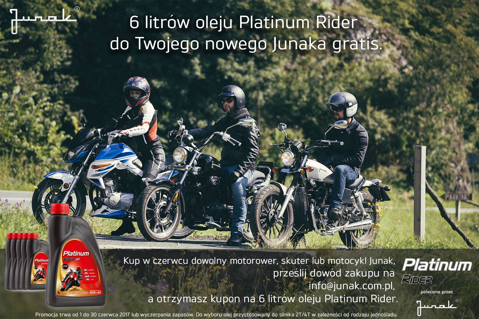 Zasady nowej akcji są niezwykle proste. W terminie obowiązywania promocji (1-30 czerwca 2017) wystarczy kupić dowolny jednoślad Junak oraz przesłać dowód zakupu na info@junak.com.pl. W zamian otrzymasz kupon upoważniający do odbioru bezpłatnych 6 butelek oleju Platinum Rider.